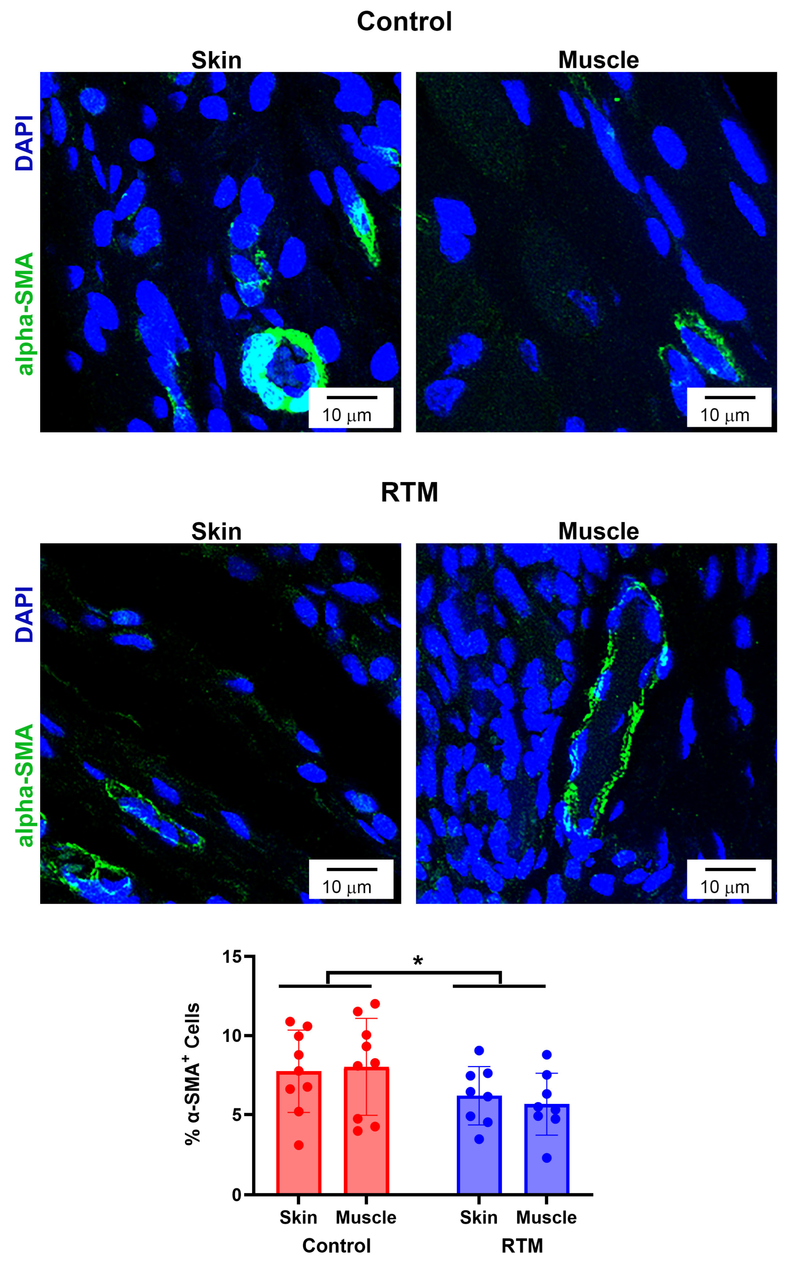 RTM coverage reduces contractile fibroblasts. Representative immunofluorescence staining for alpha-smooth muscle actin (α-SMA) at 60× magnification comparing capsules from control and RTM-wrapped implants at the skin and muscle surfaces. Scale bars = 10 μm. Quantification of the percentage of α-SMA–positive cells are shown at the bottom. Data represented as mean ± SD (n = 10/group). * indicates p < 0.05.