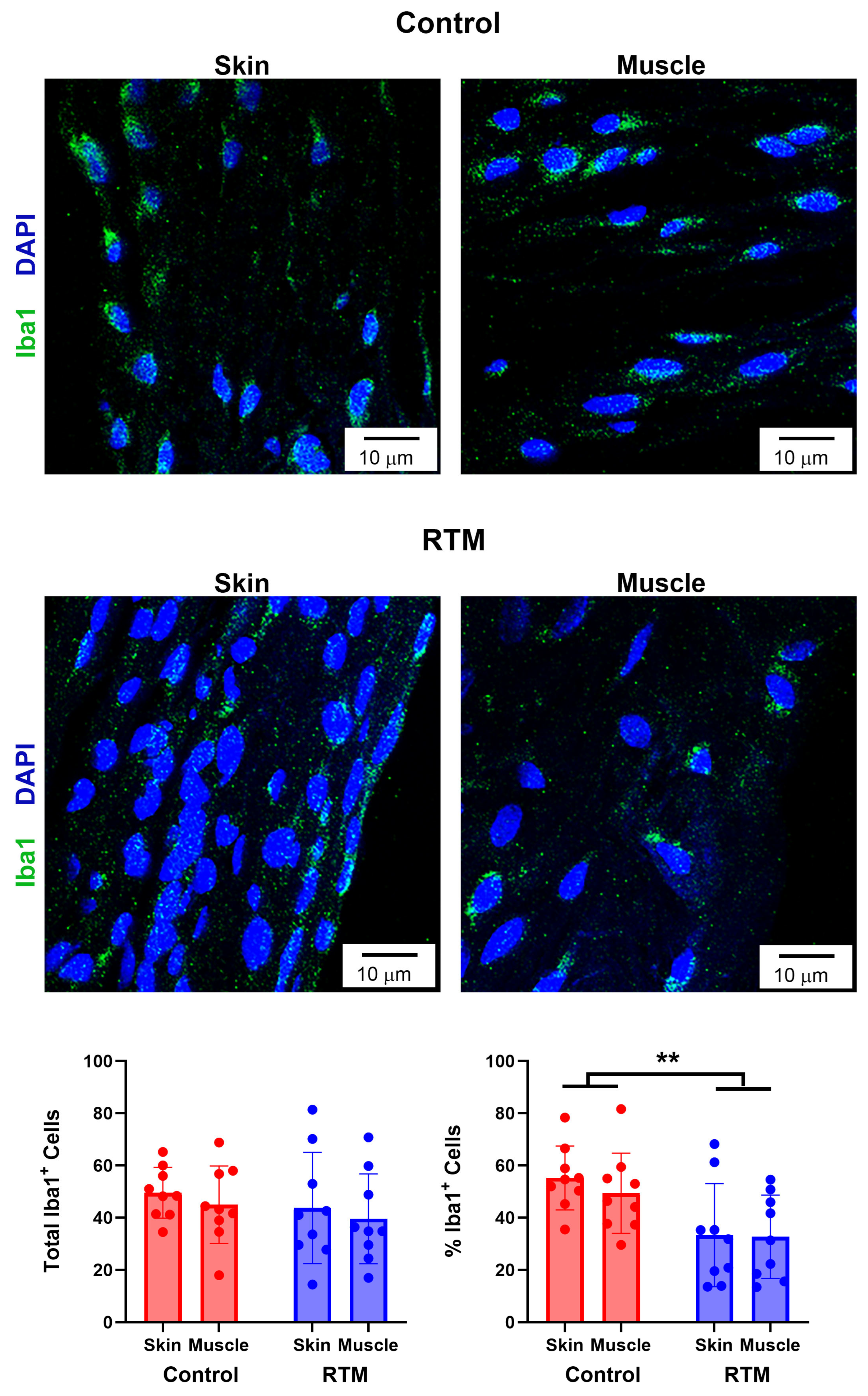 RTM coverage reduces the proportion of macrophages. Representative immunofluorescence staining for macrophages (Iba1) at 60× magnification comparing capsules from control and RTM-wrapped implants at the skin and muscle surfaces. Scale bars = 10 μm. Quantification of the percentage of Iba1-positive cells (all macrophages) are shown at the bottom. Data represented as mean ± SD (n = 10/group). ** indicates p < 0.01.