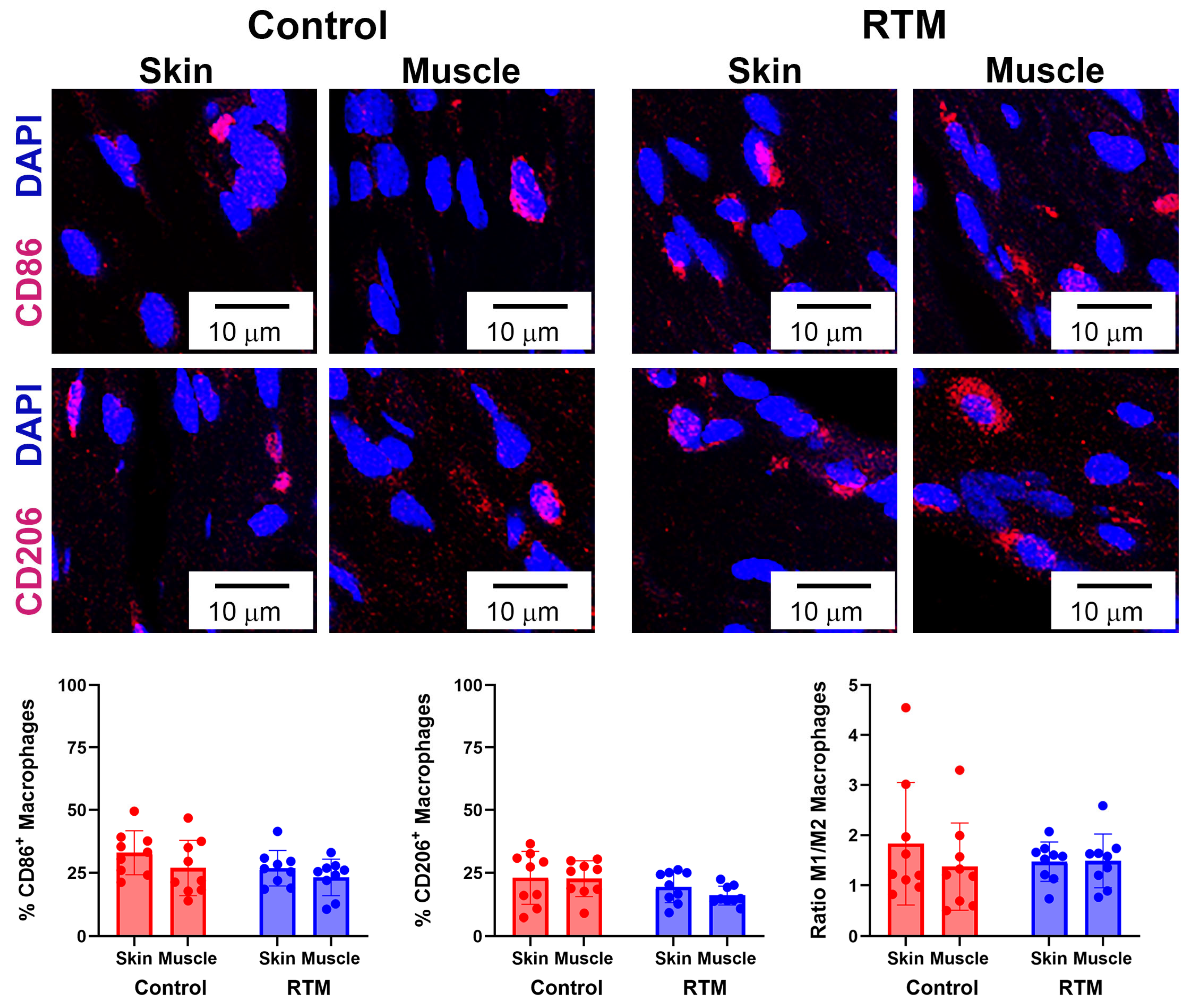 RTM coverage does not change macrophage polarization. Representative immunofluorescence staining for M1 (CD86) or M2 (CD206) macrophages at 60× magnification comparing capsules from control and RTM-wrapped implants at the skin and muscle surfaces. Scale bars = 10 μm. Quantification of the percentage of M1 and M2 macrophages are shown at the bottom. Data represented as mean ± SD (n = 10/group).