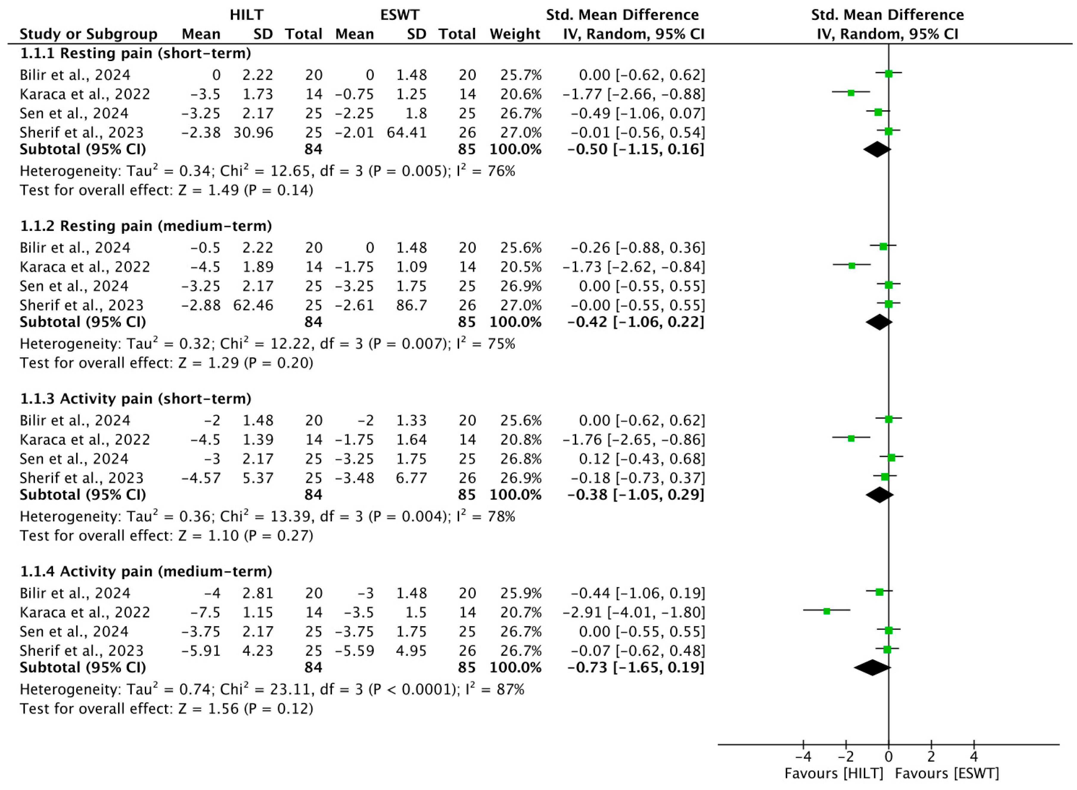 | Karaca et al., 2022 [4] | Experimental group | 14 | Female = 9 Male = 5 | 35 (24–55) (median (range)) | HILT Protocol: Total of 4 sessions over 2 weeks (2 sessions/week). Analgesic Phase: 75 s at 4 W (6 J/cm2). Biostimulation Phase: 12.5 min at 6 W (12 J/cm2). | Core Exercise Program (Both Groups): Home-based eccentric strengthening and forearm stretching. Exercise Dosage: 10 repetitions, 3 times daily for 4 weeks. Additional PT: Cold packs (15 min), continuous ultrasound (5 min), and TENS (30 min). | - | - | 2 and 6 weeks after the intervention | Pain intensity (VAS) (Resting and Activity Pain), grip strength (dynamometer), function level (Patient-Rated Tennis Elbow Evaluation questionnaire) |