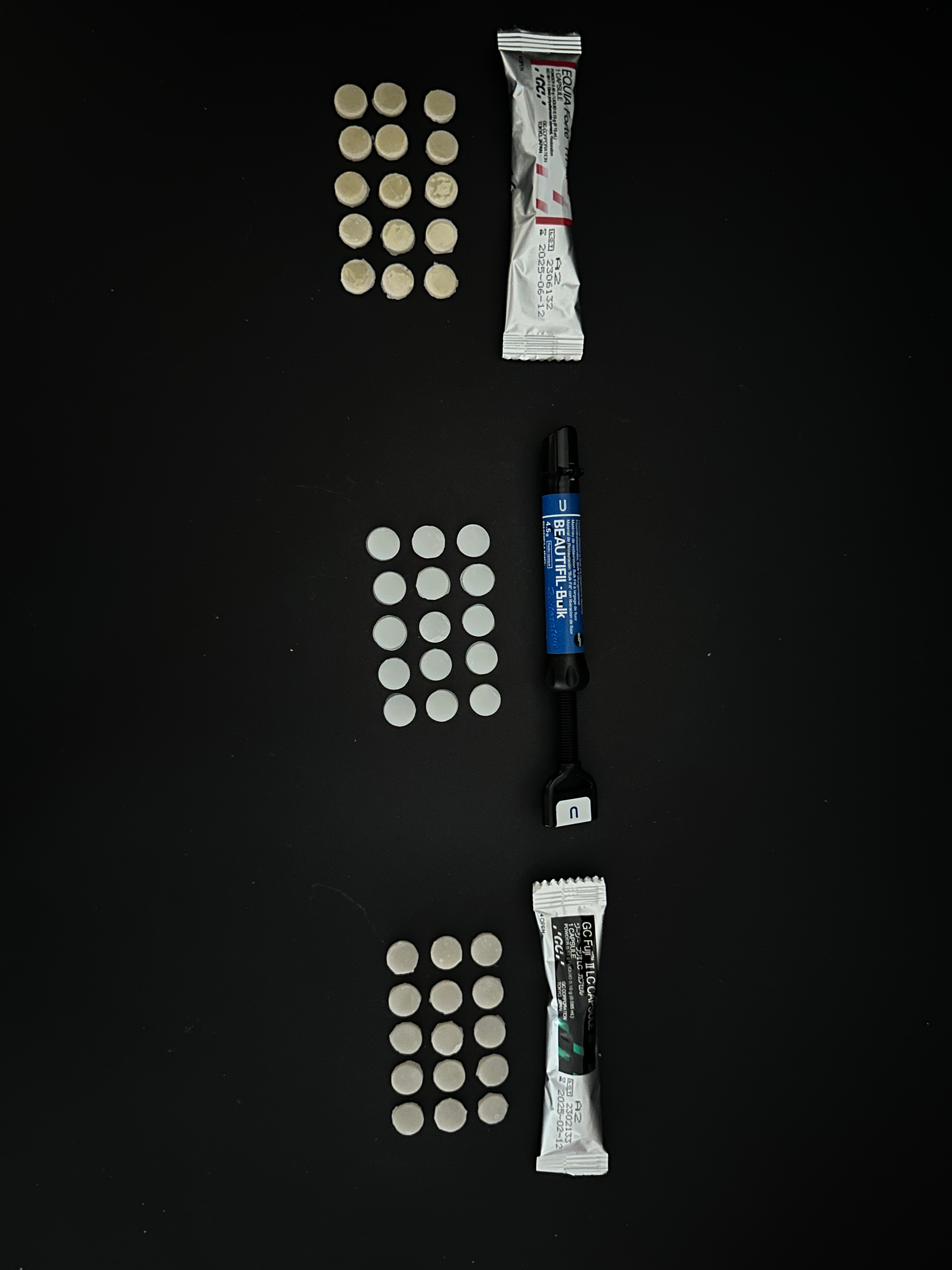 - Teflon molds (diameter: 10 mm, height: 2 mm) were used to prepare 30 specimens per group. To minimize potential batch effects, all specimens were fabricated by the same operator, using identical molds, materials from the same batch numbers, and the same light-curing unit, within a single preparation period.