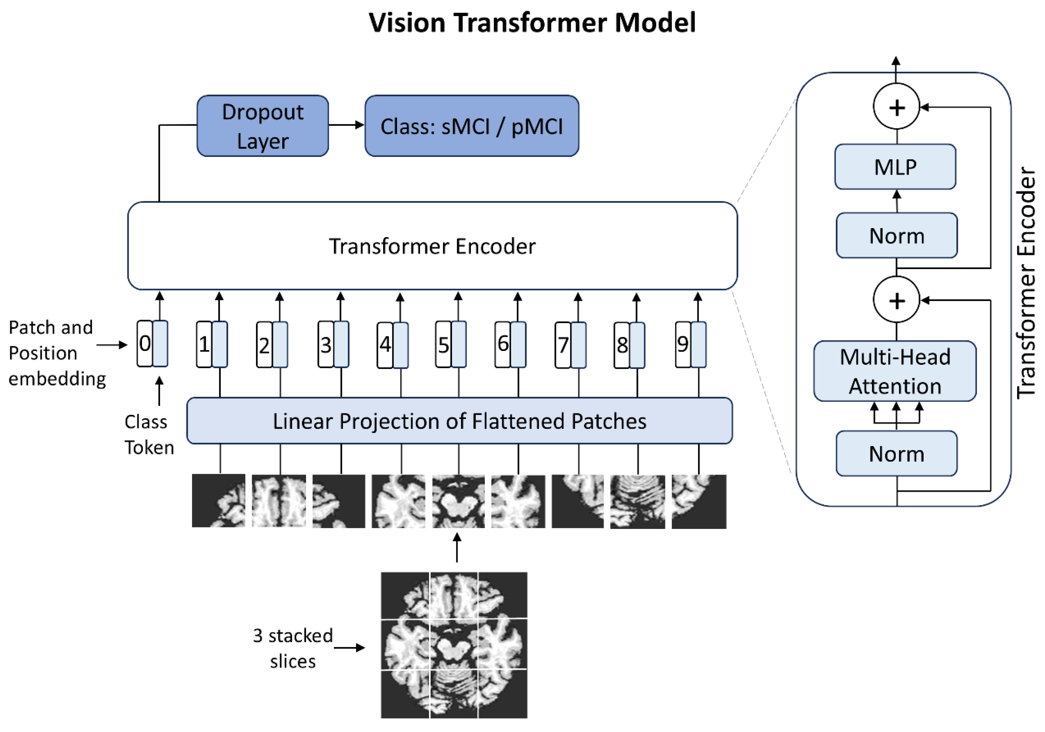 - Hoang, G.M.; Kim, U.-H.; Kim, J.G. Vision Transformers for the Prediction of Mild Cognitive Impairment to Alzheimer’s Disease Progression Using Mid-Sagittal sMRI. Front. Aging Neurosci. 2023, 15, 1102869. [Google Scholar] [CrossRef] [PubMed]