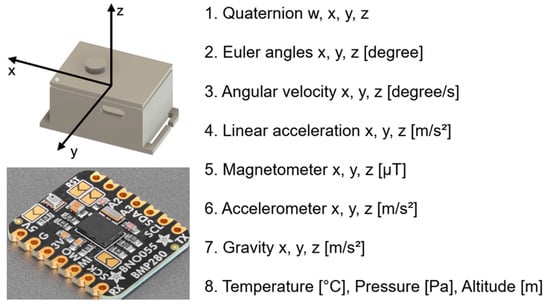 The IMU sensors used in this study were an Adafruit BNO055 Absolute Orientation Sensor (Adafruit Industries, New York, NY, USA) and a breakout board equipped with BNO055, a 9-axis IMU manufactured by Bosch; Gerhard-Kindler-Strasse 9, 72770 Reutlingen, Germany (Figure 1). Unlike conventional accelerometers, gyroscopes, and magnetometers, the BNO055 incorporates an ARM Cortex-M0 microcontroller that performs internal sensor fusion and directly outputs “Absolute Orientation” data. The device was calibrated using a proprietary algorithm developed by Bosch, the detailed mechanism of which has not been publicly disclosed.