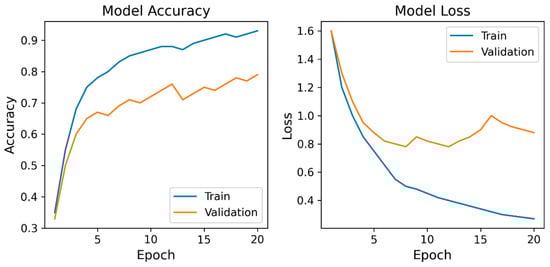 Learning curves of the convolutional neural network model. Model Accuracy: training and validation accuracy; Model Loss: training and validation loss. The curves demonstrate a steady improvement and convergence in accuracy and loss during training. Validation accuracy plateaued around 0.8, and validation loss stabilized after approximately 10 epochs, indicating stable optimization and the absence of severe overfitting.