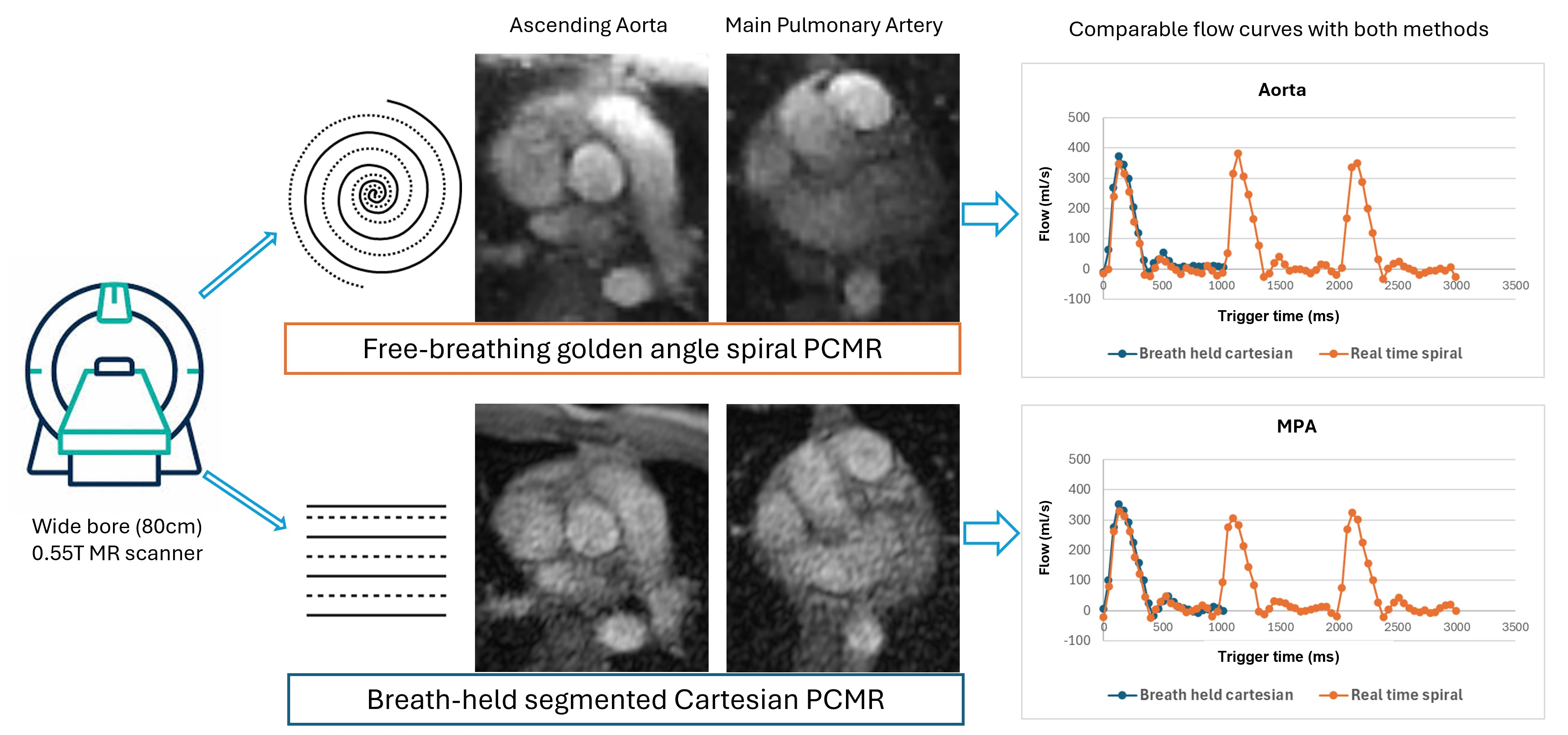 In conclusion, we implemented and validated the feasibility of a free-breathing golden-angle spiral RT-PCMR sequence on a commercial wide bore 0.55T MR system with moderate gradient performance in a preliminary cohort of healthy volunteers and patients. The application provides a promising tool when free-breathing, real-time flow assessment is desired in obese and claustrophobic patient cohorts who cannot be evaluated on narrower-bore higher-field systems. Therefore, free-breathing RT-PCMR imaging on this scanner can further contribute to increased CMR access for obese and claustrophobic patients.