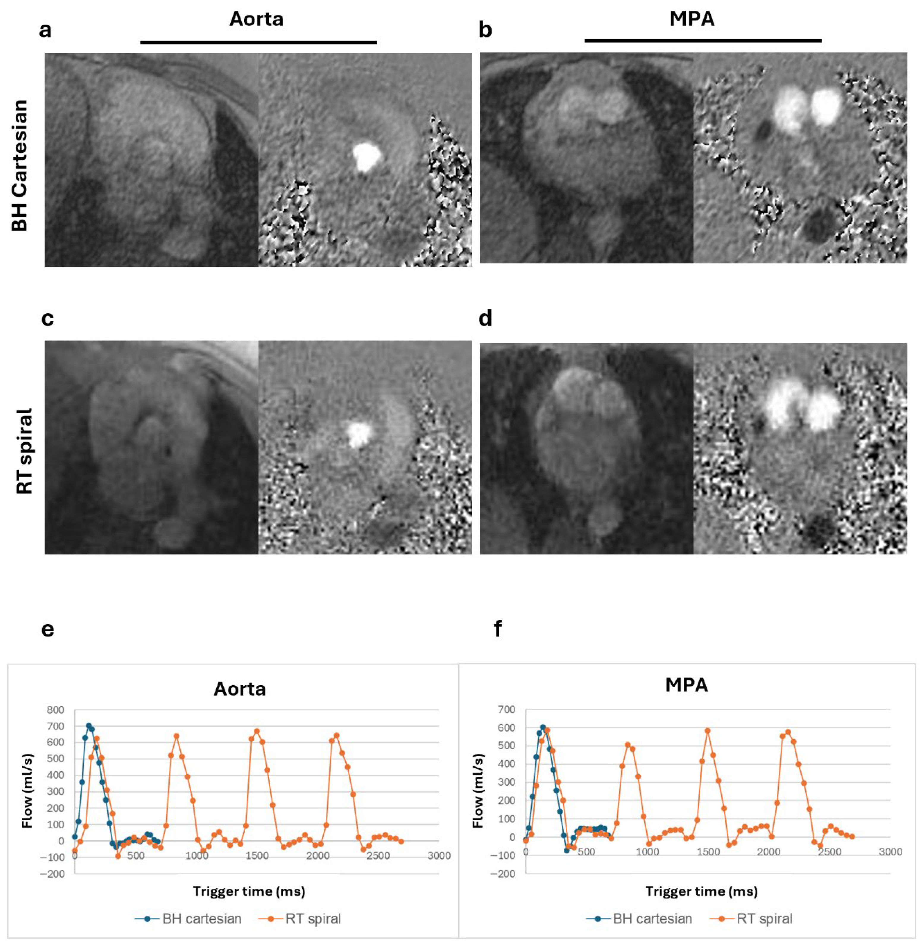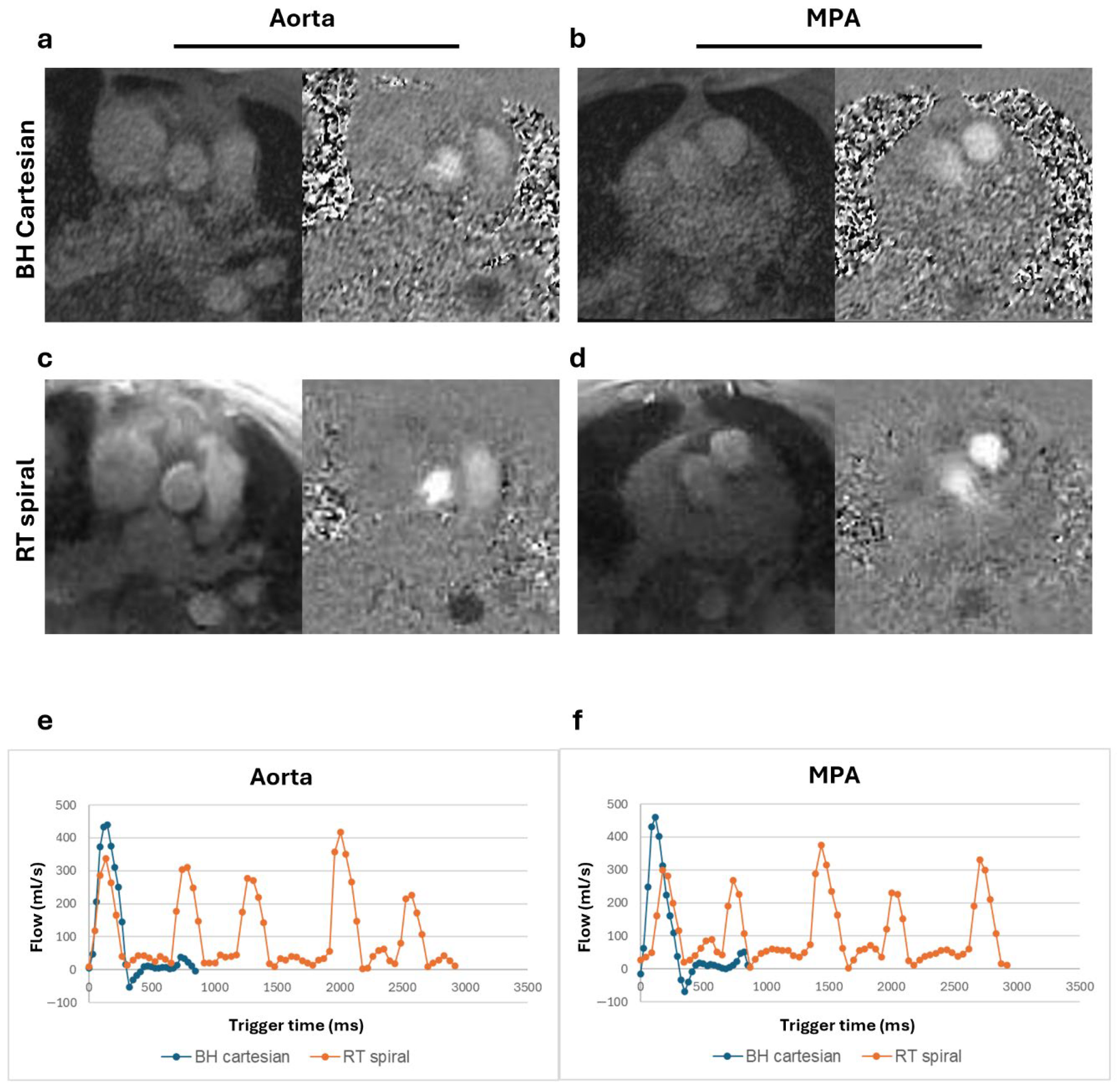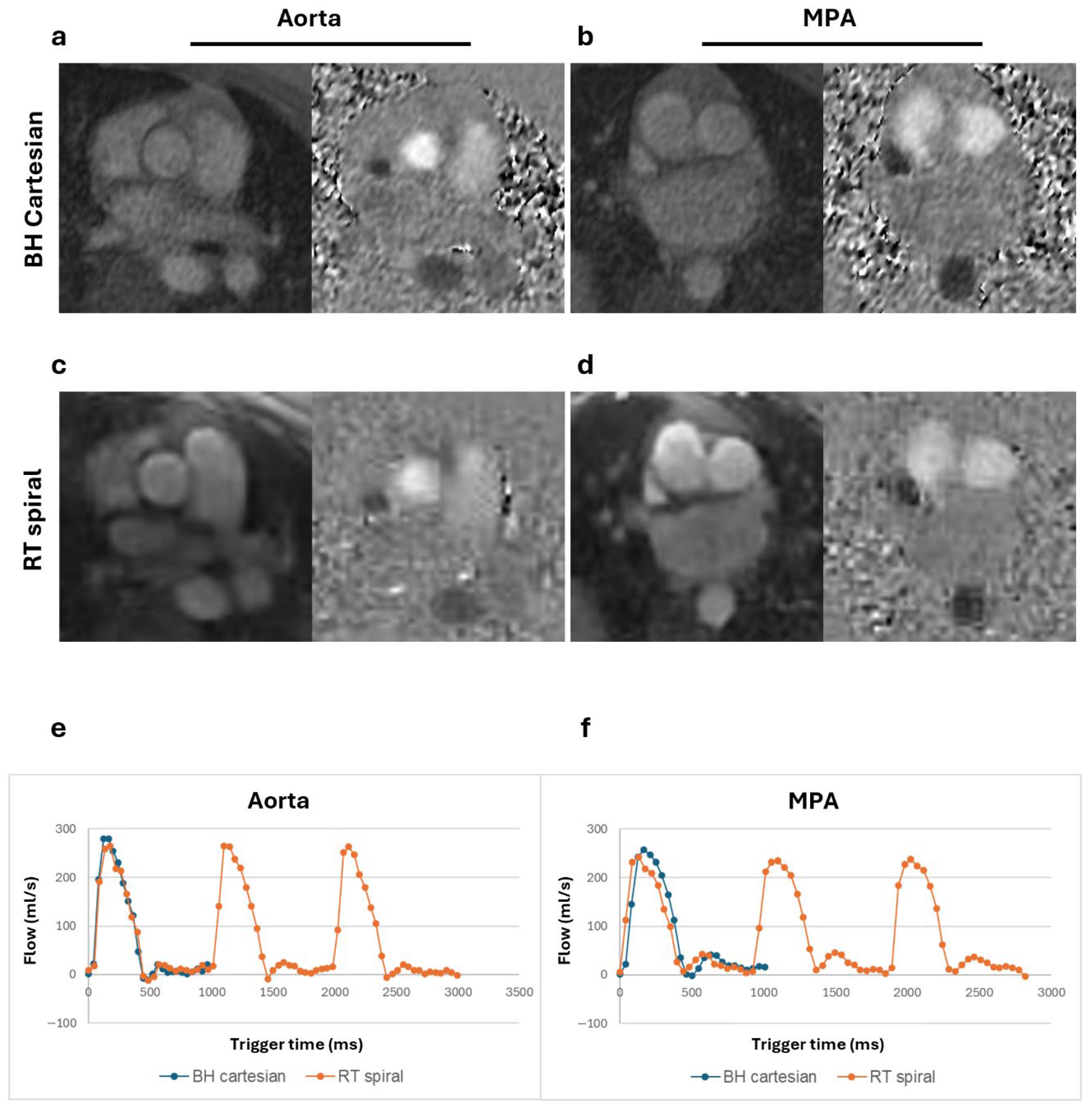 Figure 2. Magnitude and phase images and flow curves from a healthy volunteer (BMI = 21.0 kg/m2). Magnitude and phase images of the aorta and main pulmonary artery (MPA) for the breath-held (BH) Cartesian (a,b) and real-time (RT) spiral acquisitions (c,d). Total flow from the BH segmented acquisition plotted alongside the multiple complete beats from the RT spiral acquisition for both the aorta (e) and the MPA (f) show comparable flow peaks.
