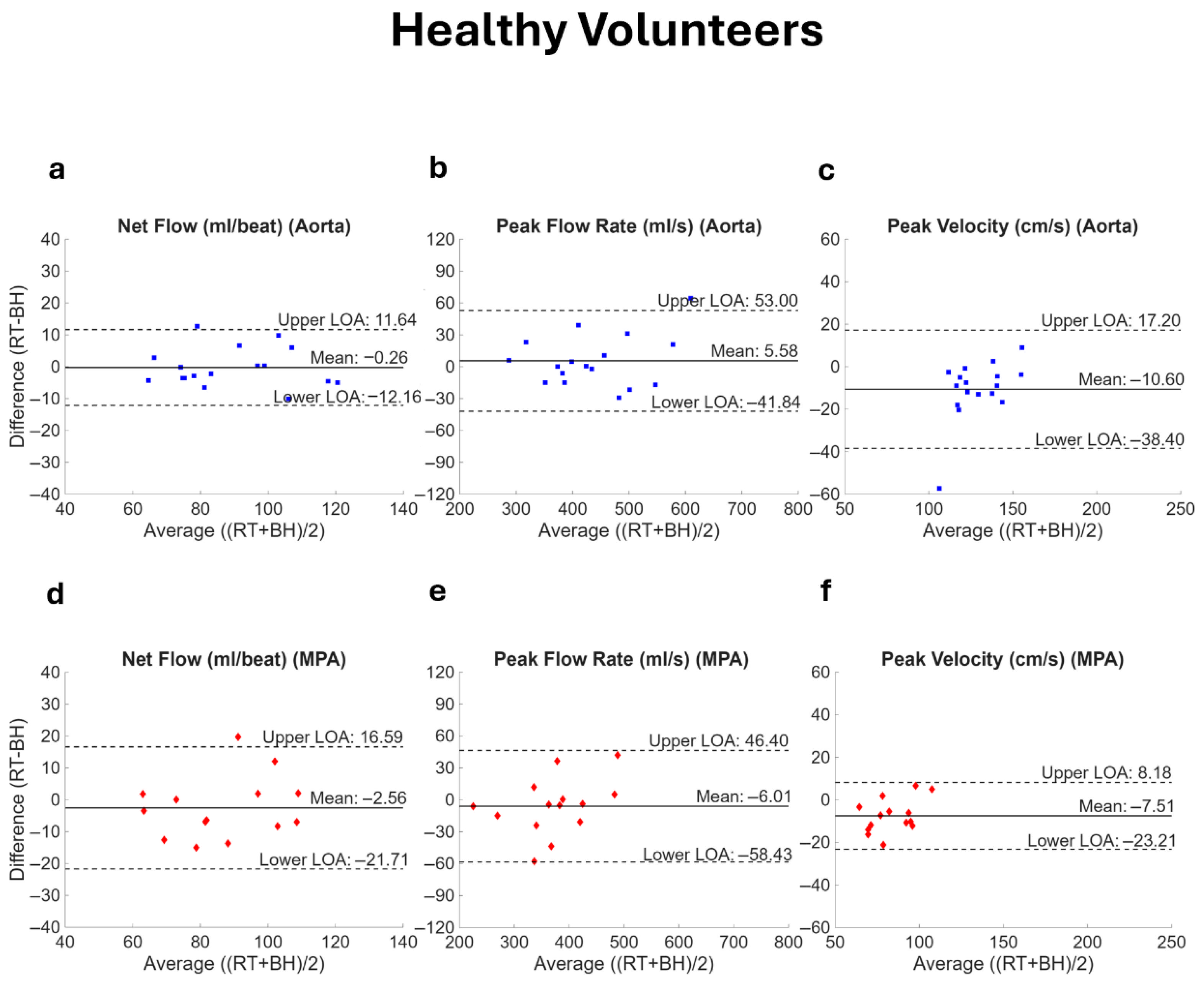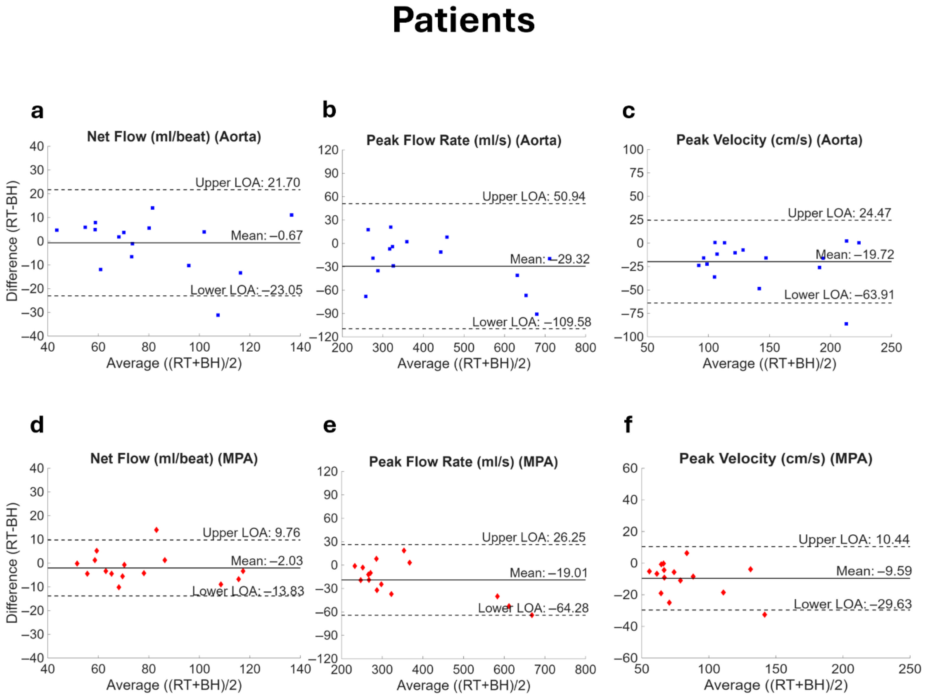 Figure 6. Bland–Altman plots comparing flow parameters in healthy volunteers. Net flow, peak flow rate, and peak velocity acquired with real-time (RT) spiral and breath-held (BH) Cartesian PCMR are compared for both the aorta (ac) and the main pulmonary artery (MPA, (df)). The RT measurement represents the value averaged over the number of complete heartbeats available. The solid line represents the bias while the dotted lines show the limits of agreement (LOA, mean ± 1.96 standard deviation).