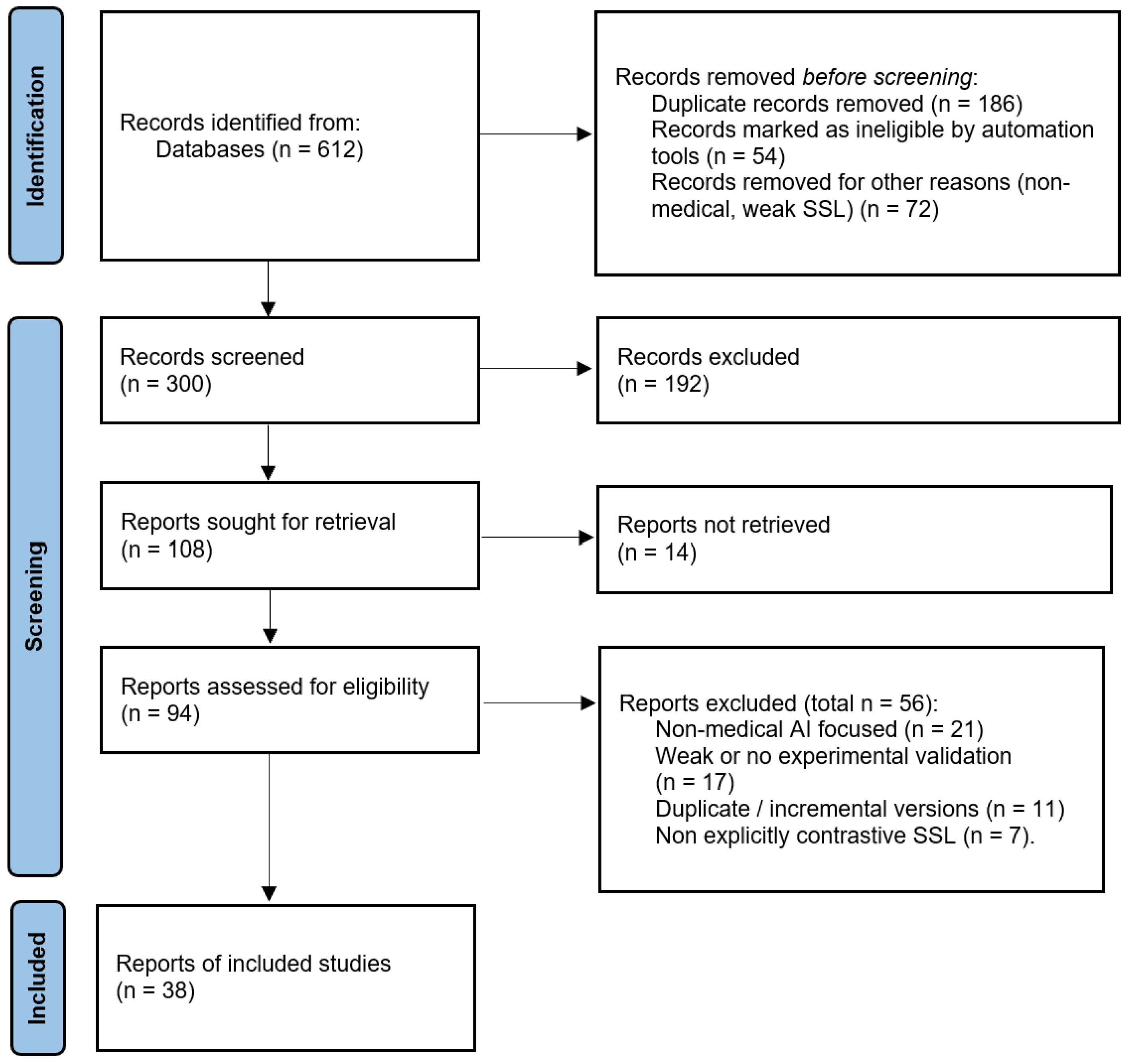 Records were deduplicated, then screened by title/abstract, followed by full-text assessment using the eligibility criteria. Screening was performed independently by G.O. and I.D.M. Disagreements were resolved by consensus, and unresolved conflicts were adjudicated by K.A., E.E., C.M., and C.W.C. Reasons for full-text exclusion were recorded (e.g., non-medical domain, insufficient methodological detail, no contrastive objective, no empirical evaluation). Of 612 identified records, 300 were screened after duplicate and automated exclusions. Following a full-text assessment of 94 reports, 38 studies were included. Figure 1 summarizes the selection process.