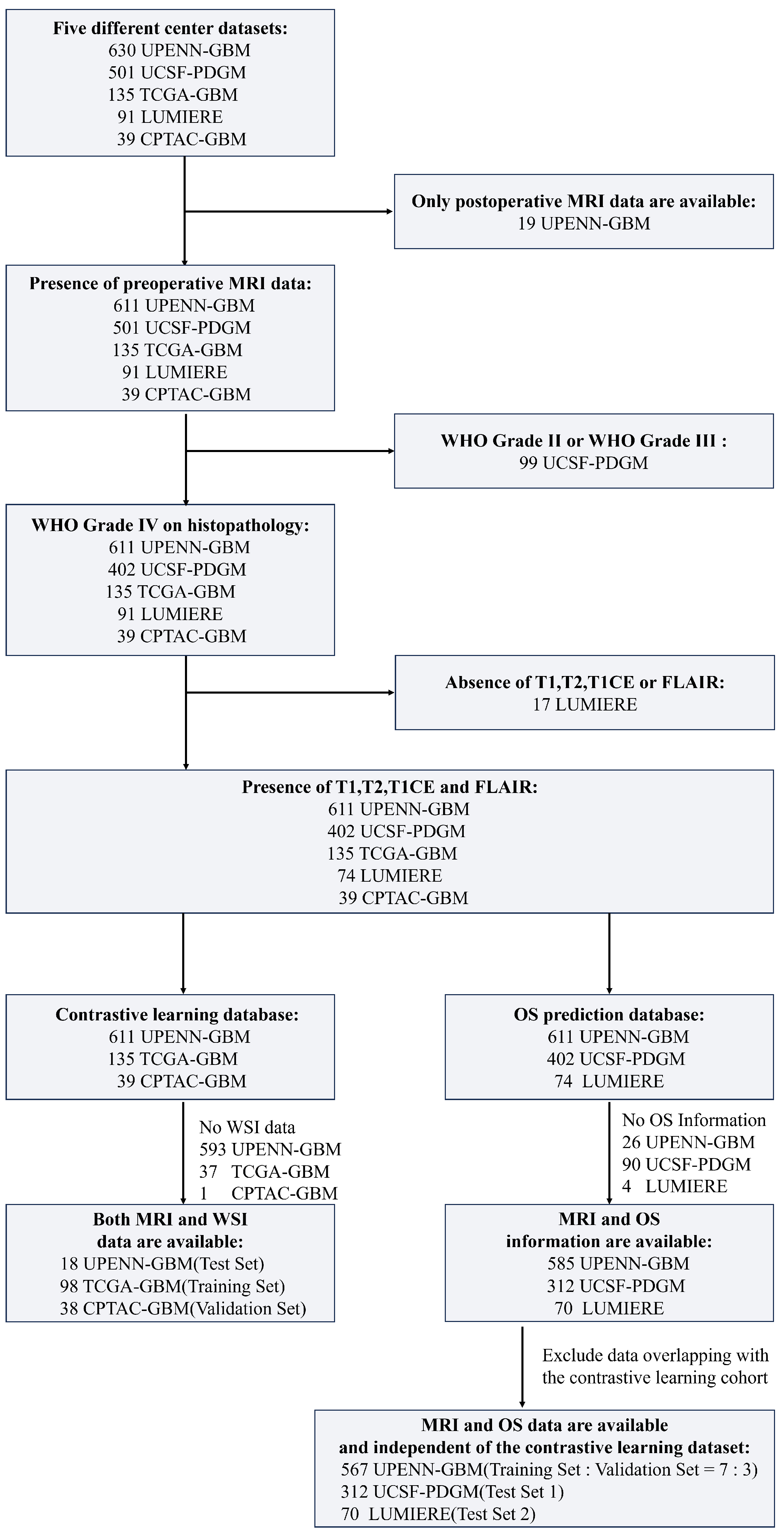 The UPENN-GBM dataset contains data from 630 patients, of whom 611 have preoperative MRI and 19 have only postoperative MRI. The UCSF-PDGM dataset comprises 501 adult patients with histopathologically confirmed diffuse gliomas, including 56 WHO grade II and 43 WHO grade III cases. In this study, only patients diagnosed with WHO grade IV GBM were retained for analysis. The TCGA-GBM and CPTAC-GBM datasets—both contributing to the 2021 BraTS Challenge—include preoperative MRI scans from 135 and 39 GBM patients, respectively. The Lumiere dataset consists of longitudinal imaging data from 91 GBM patients. The detailed data inclusion process is shown in