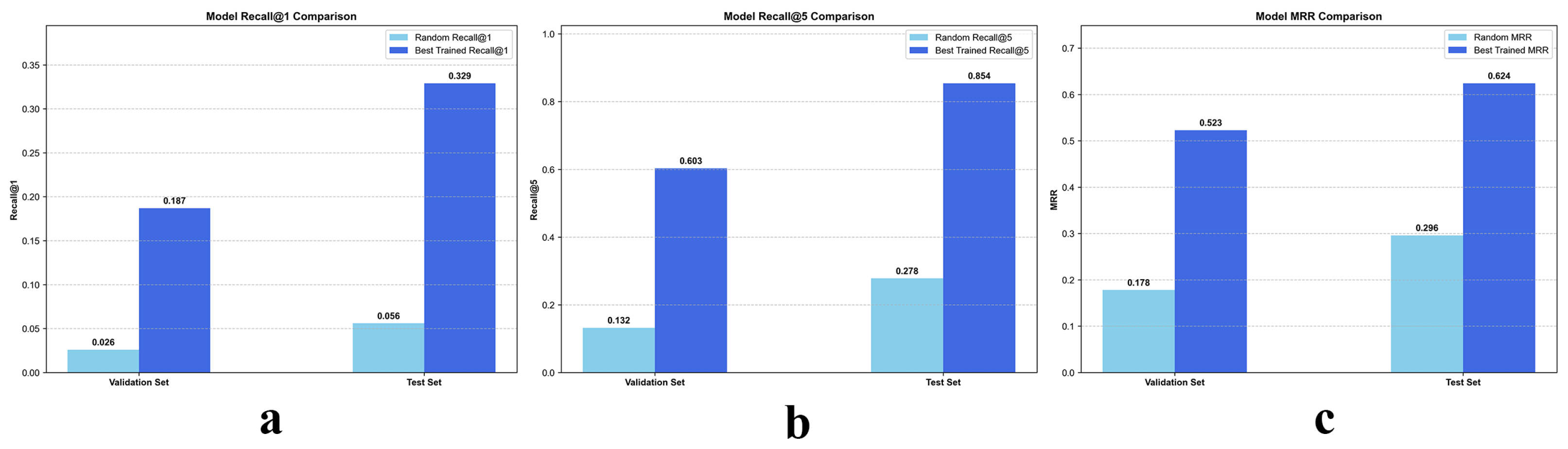 Figure 4, the proposed contrastive learning framework, CL-IPSA, demonstrates strong performance in the semantic alignment task between MRI and whole-slide images—two intrinsically heterogeneous modalities. To assess the effectiveness of our method, we first established a baseline using a randomly initialized (untrained) version of CL-IPSA. On the validation and test sets, this random baseline achieved Recall@1 of 0.026 and 0.056, respectively, and Recall@5 of 0.132 and 0.278.