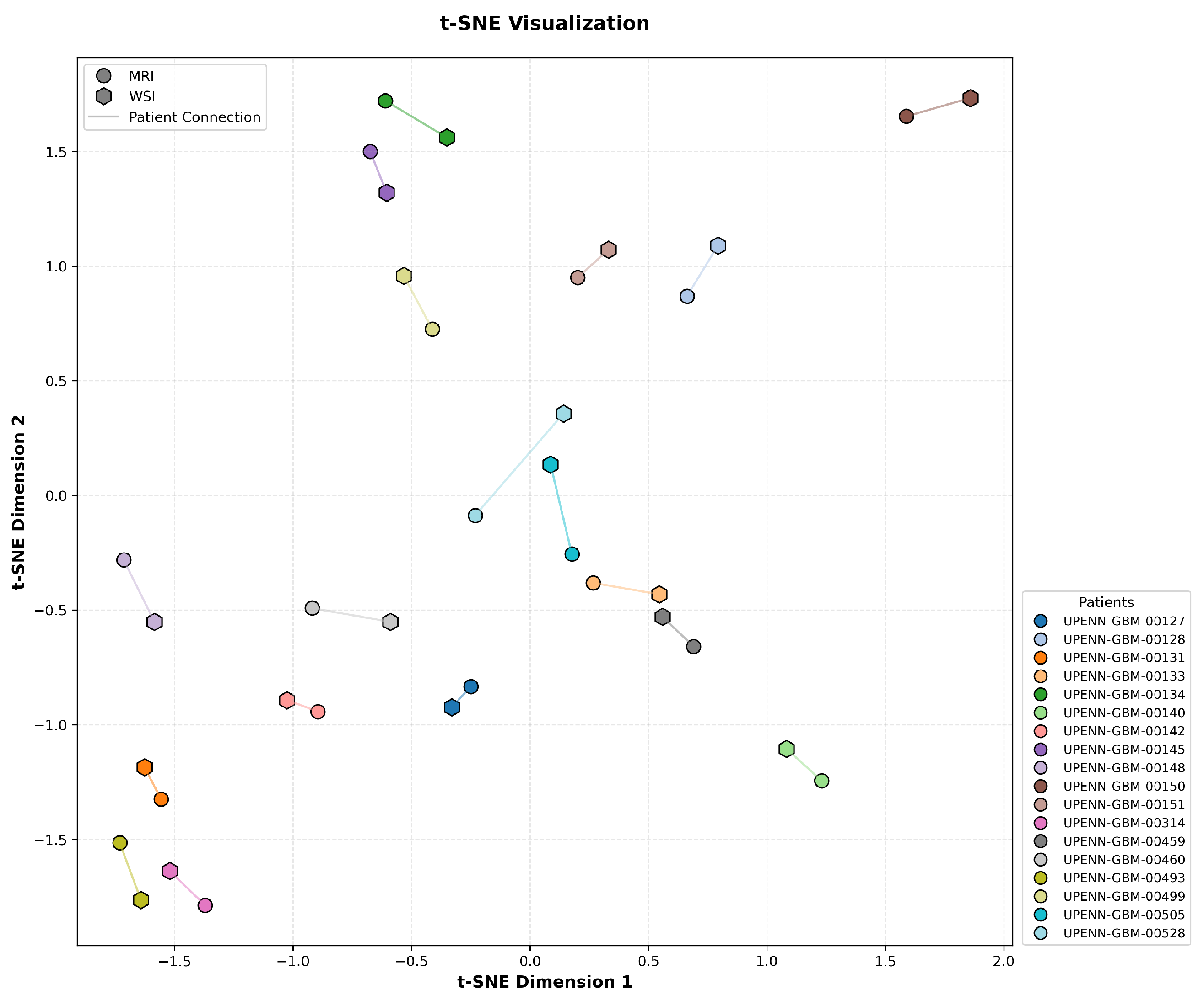 Figure 5, each MRI–WSI pair from the same patient is linked by a line to indicate their shared identity. Critically, the embeddings exhibit a clear pattern consistent with the objective of contrastive learning: representations from the same patient across modalities are pulled into close proximity, while embeddings from different patients, regardless of modality, are well separated in the unified embedding space. This structure demonstrates that CL-IPSA successfully minimizes intra-patient cross-modal distance while maximizing inter-patient separation, thereby learning patient-specific, modality-invariant representations. These results provide visual confirmation that our contrastive framework achieves meaningful semantic alignment even with limited paired data, supporting its potential for clinical deployment.
