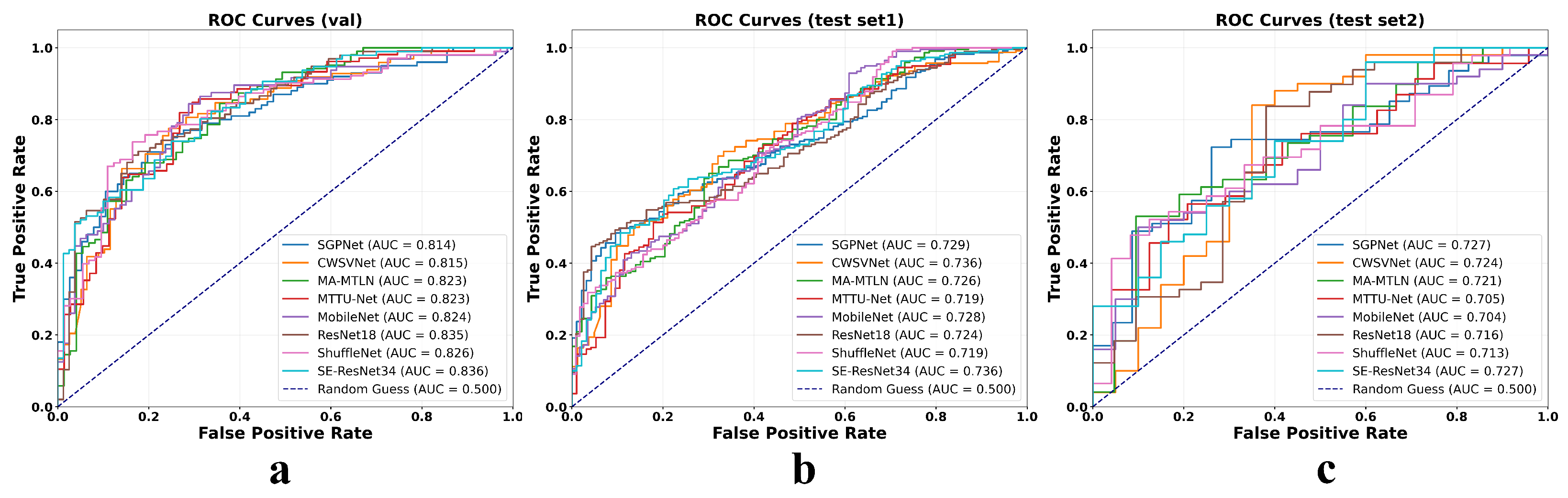 Table 2, under the unimodal setting using only MRI as input, all tested CNN models demonstrated robust discriminative capability across the validation set and two independent test sets. AUC values on the validation set consistently exceeded 0.7, while those on both test sets remained above 0.6. These results indicate that, despite the inherent complexity and heterogeneity of large-scale clinical data, deep learning models can effectively extract prognostically informative features from MRI alone, enabling overall survival (OS) prediction with meaningful generalization. Specifically, SEResNet34 achieved the best performance on the validation set (AUC = 0.753), highlighting the advantage of its channel-attention mechanism in capturing informative radiological patterns. On Test Set 1, the lightweight MobileNet yielded the highest AUC (0.664), likely due to its efficient feature compression and robustness under limited-sample distributions. On Test Set 2, the multi-task learning architecture MA-MTLN achieved the best performance (AUC = 0.663), demonstrating the effectiveness of this novel design.