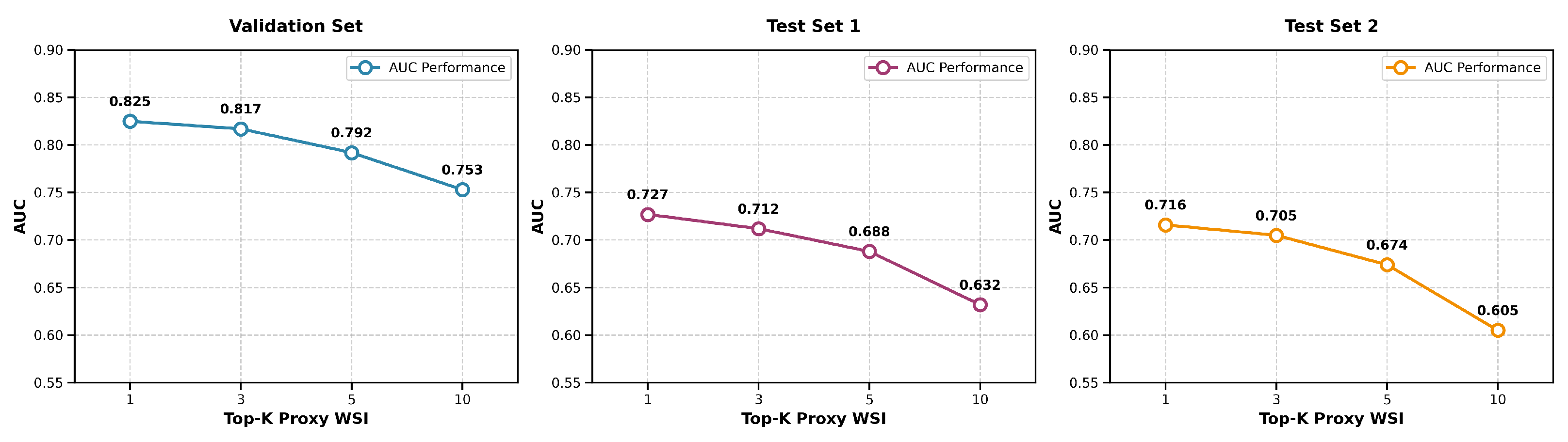 To assess the robustness of proxy feature retrieval, we evaluated the impact of varying the number of nearest neighbors k in the k-NN search. We fused the top-k proxy pathological features, weighted by similarity, with MRI features to predict survival and computed the average AUC across eight models for k = 1, 3, 5, and 10. Performance peaked at k = 1 and declined steadily as k increased, indicating that additional neighbors introduce noise rather than useful information. This trend was consistent across both internal and external test sets, suggesting that the single most similar proxy WSI captures the dominant prognostic signal. The AUC values across all datasets as a function of k are summarized in