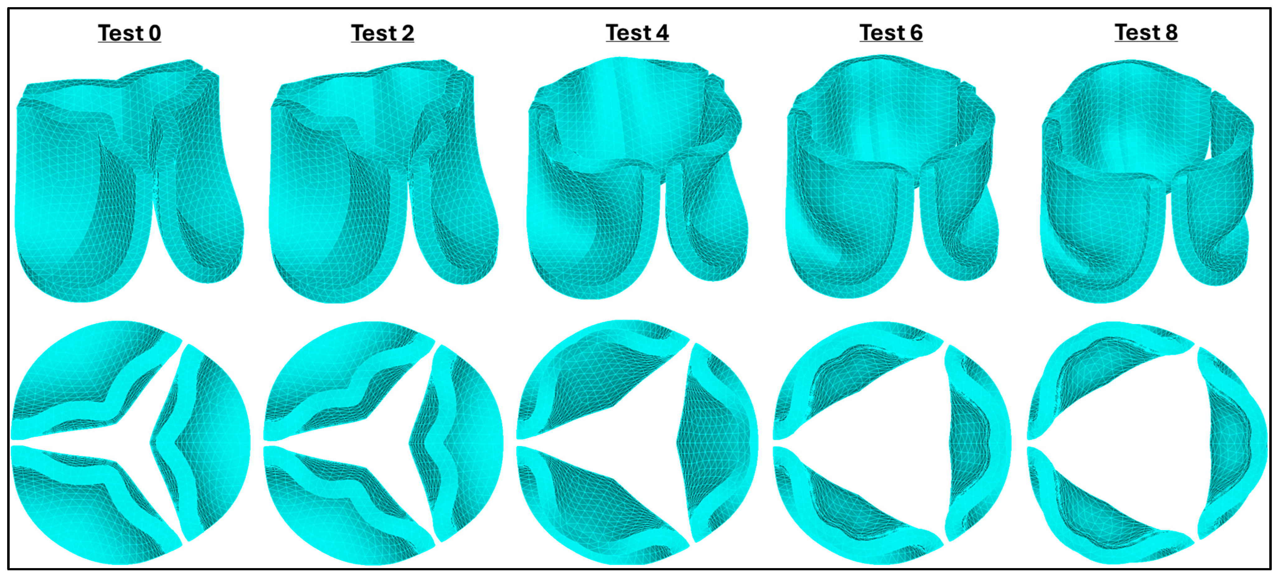 - Li, K.; Sun, W. Simulated transcatheter aortic valve deformation: A parametric study on the impact of leaflet geometry on valve peak stress. Int. J. Numer. Method. Biomed. Eng. 2017, 33, e02814. [Google Scholar] [CrossRef]
