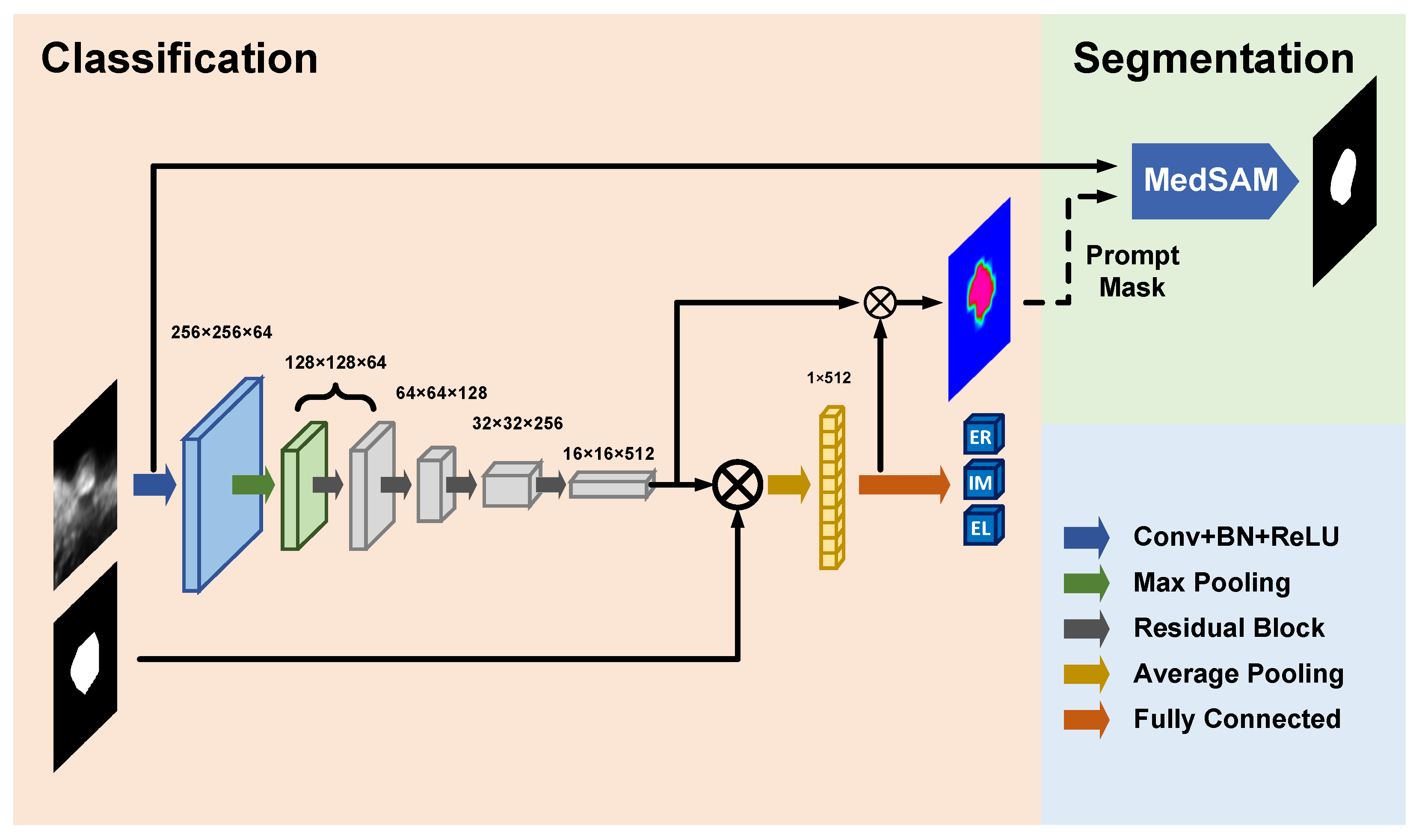 - Masked-ResNet-NDS: ResNet with ground truth masks used in average pooling in the training stage. In the testing stage, the data passes through the network twice, as described in Section 2.2. In this model, the CAM was not supervised by the Dice loss in the training stage.