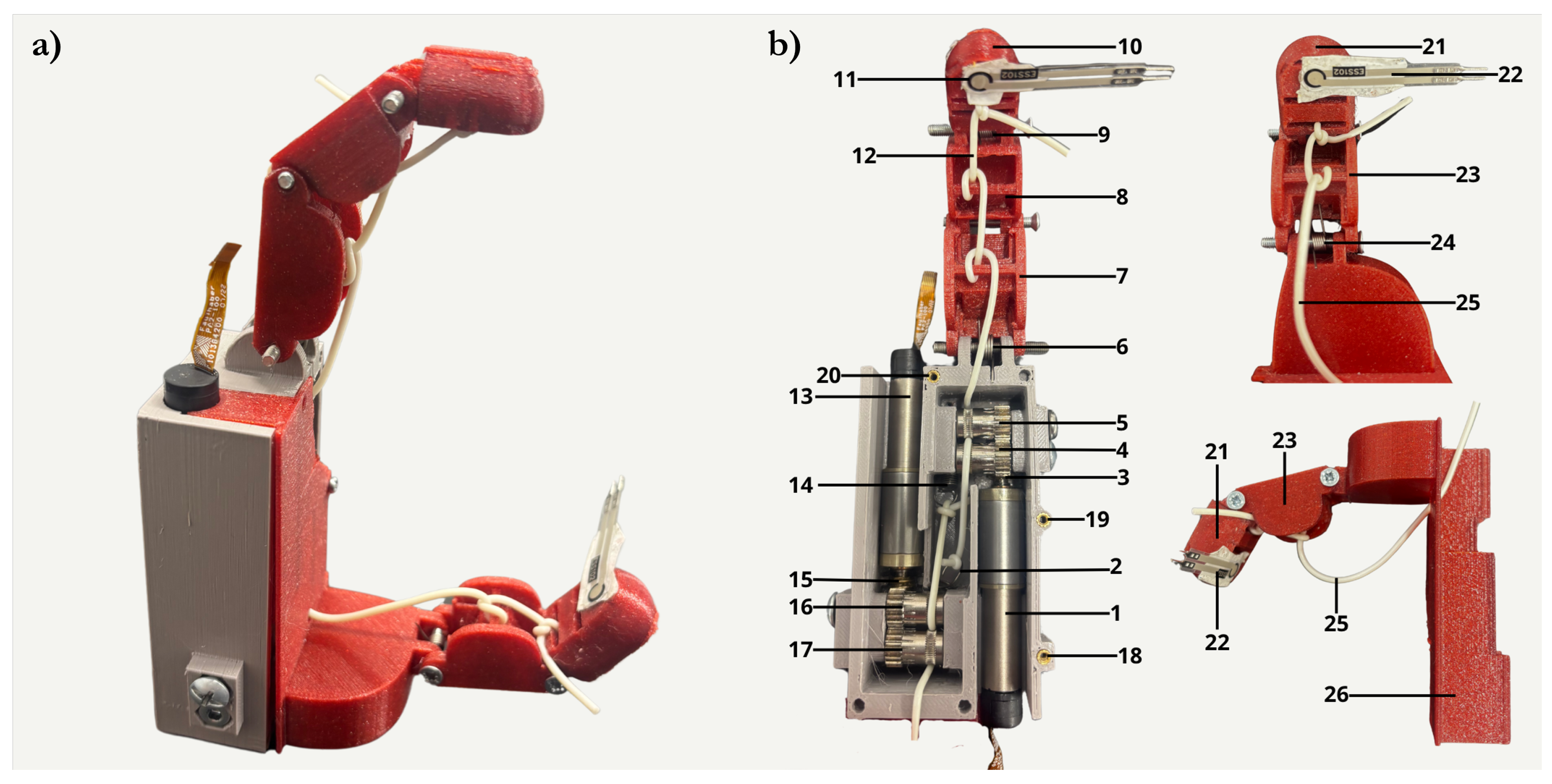 - Estay, D.; Basoalto, A.; Ardila, J.; Cerda, M.; Barraza, R. Development and implementation of an anthropomorphic underactuated prosthesis with adaptive grip. Machines 2021, 9, 209. [Google Scholar] [CrossRef]