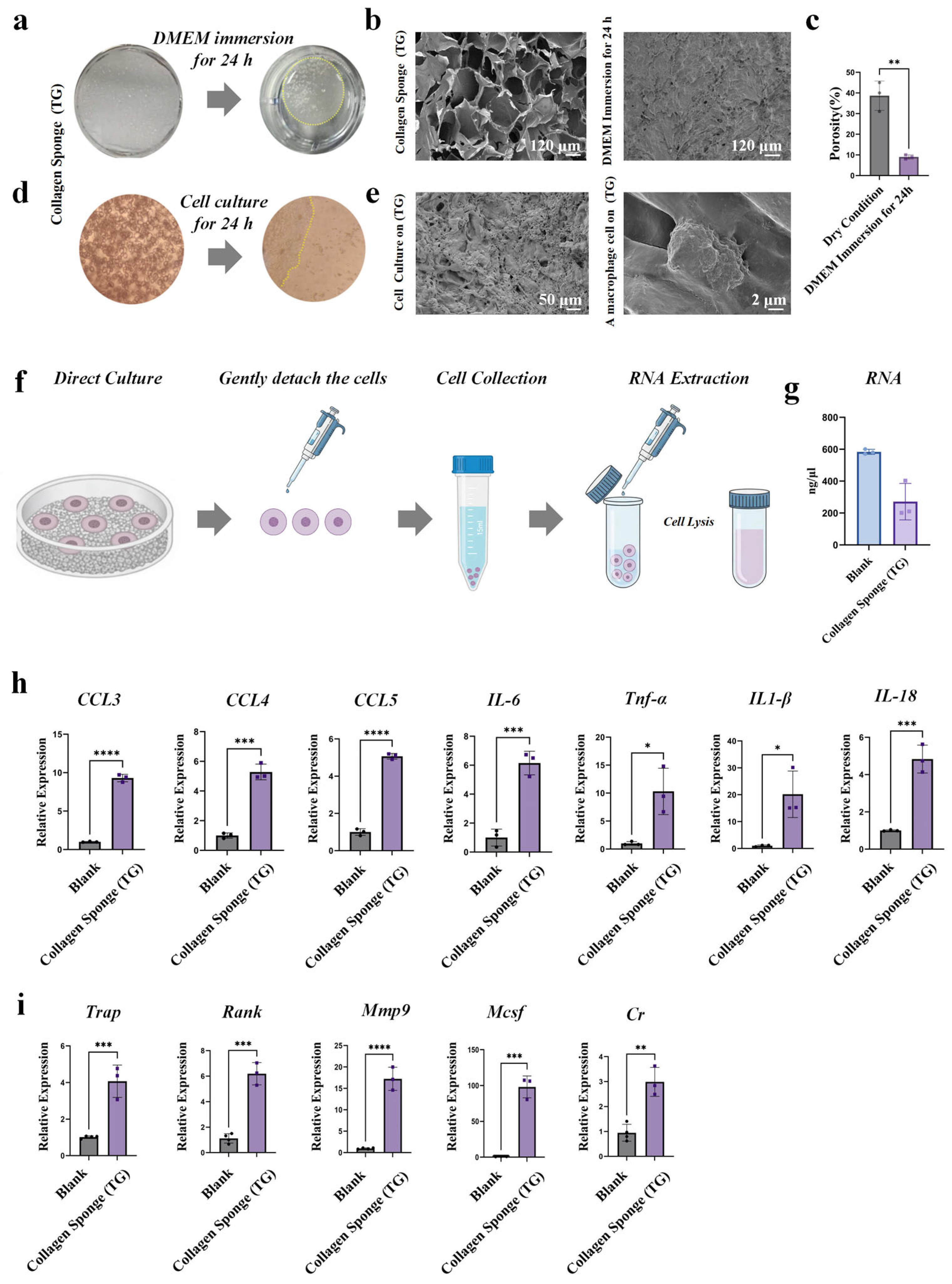 3.4. Collagen Sponges with Enhanced Microstructure Stability Downregulated the Inflammatory Response of Macrophages