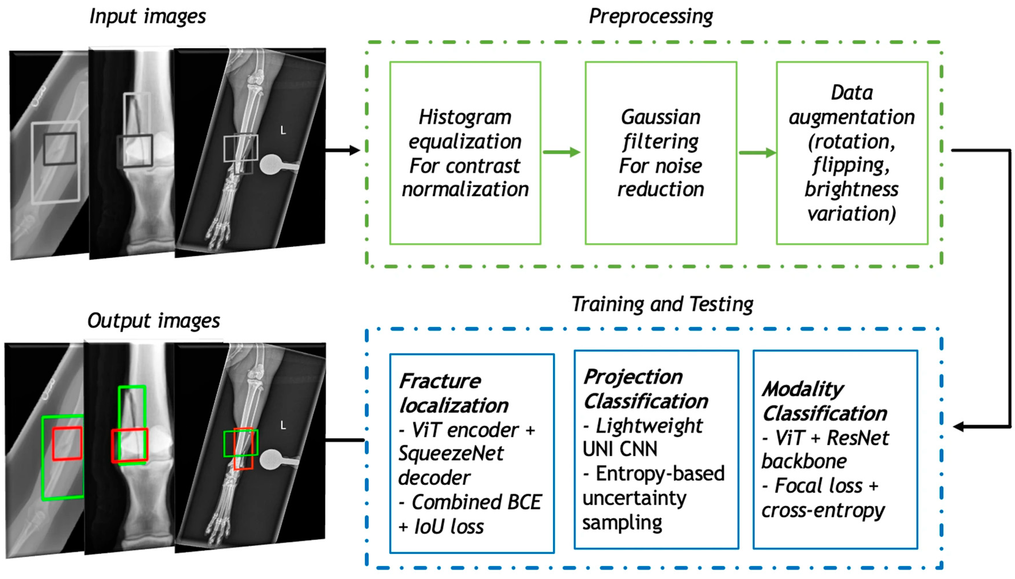 To develop a robust and generalizable model for cross-species fracture detection, we built a deep learning pipeline that included curated datasets, tailored preprocessing steps, and a hybrid model architecture (