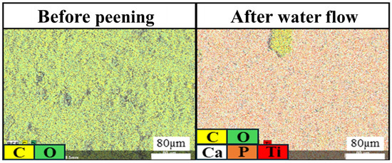 Figure 4 shows the surface analysis images before peening and after water flow. The surface analysis image after water flow reveals the presence of P, Ca, and Ti, confirming the transfer of titanium apatite onto the test specimen.