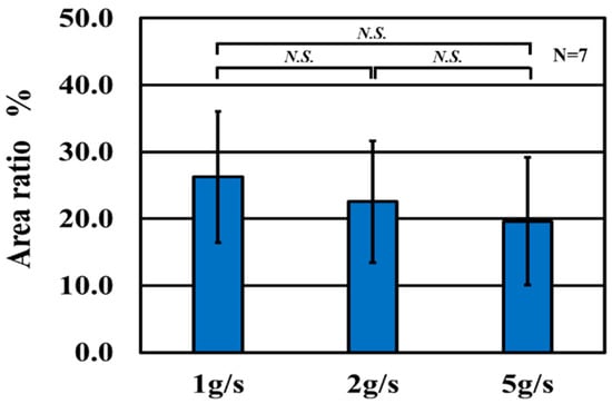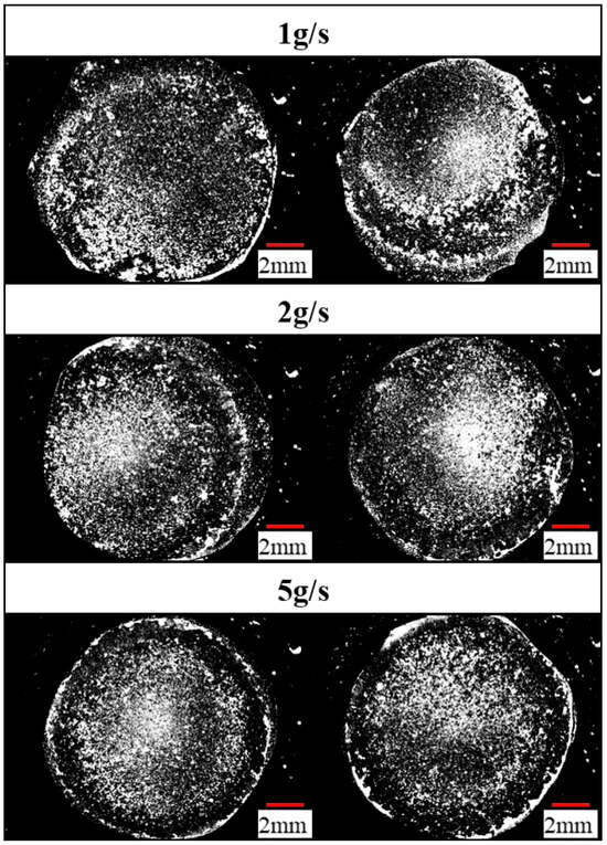 Figure 5 shows a binary image of the test specimen after water flow, processed in ImageJ. Figure 6 shows the area ratio of the transferred portion calculated from a binarized image. No significant difference can be observed between the peening mass flow rates of 1, 2, and 5 g/s. However, because this area fraction measurement reflects only the surface condition, it is conceivable that reducing the peening mass flow rate increases the particle transfer intensity, despite no significant observable difference.