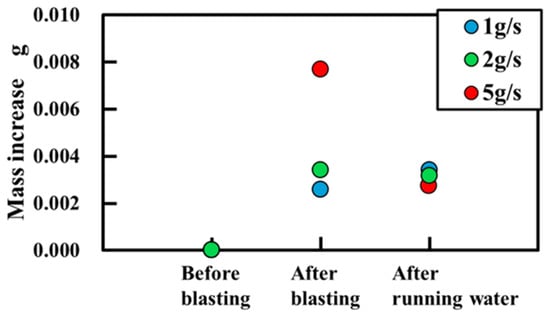 Figure 15 shows the increase in mass before peening, after peening, and after water flow. After peening and water flow, the 15 g total peening mass condition exhibits the largest increase in mass.