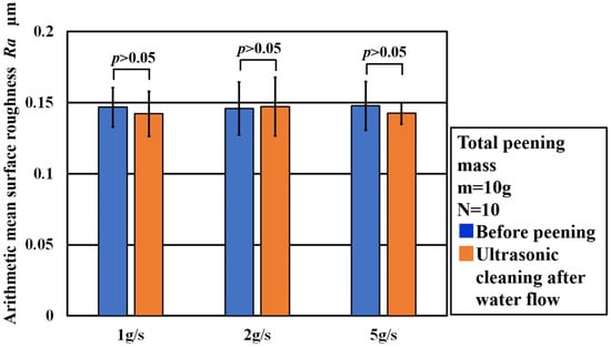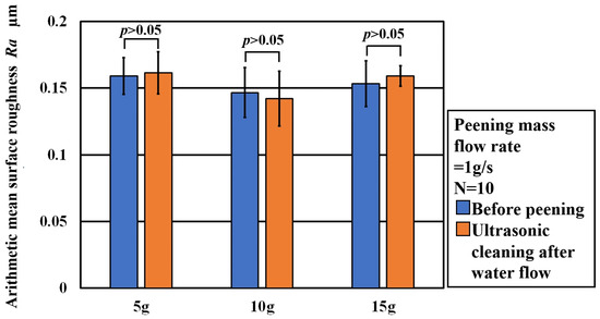 Figure 16 shows a comparison of the arithmetic mean surface roughness Ra before peening and that after ultrasonic cleaning following water flow. Regardless of the peening conditions, little change in the arithmetic mean surface roughness Ra can be observed between ultrasonic cleaning without peening and ultrasonic cleaning after water flow.