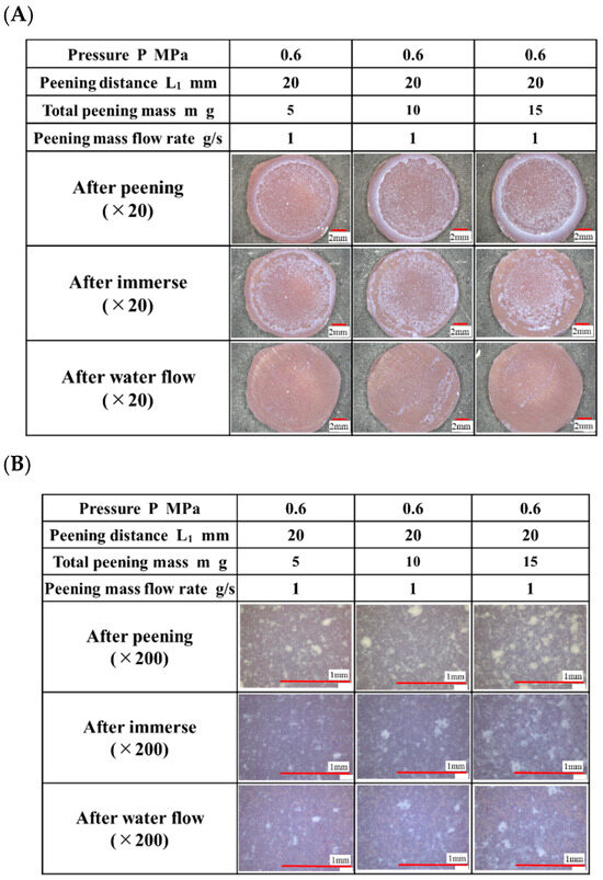 Figure 3A,B show optical microscopy images of the peened surface at different peening mass flow rates as well as those of the peened specimen surfaces after immersion and water flow. After peening, the specimen with a peening mass flow rate of 5 g/s exhibits the highest titanium apatite transfer. However, after immersion and water flow, the particles peeled off. For peening mass flow rates of 1 and 2 g/s, little difference can be observed in the transfer pattern.