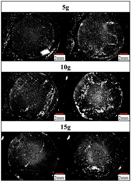 Figure 14 shows the area ratio of the transferred portion calculated from a binarized image. Among the three total peening masses (5, 10, and 15 g), 10 g exhibits the greatest area ratio of transferred material.