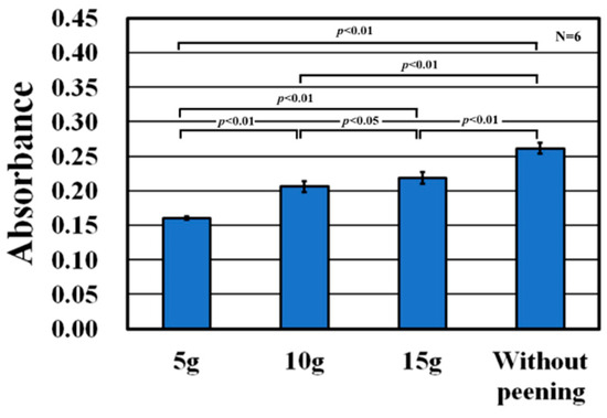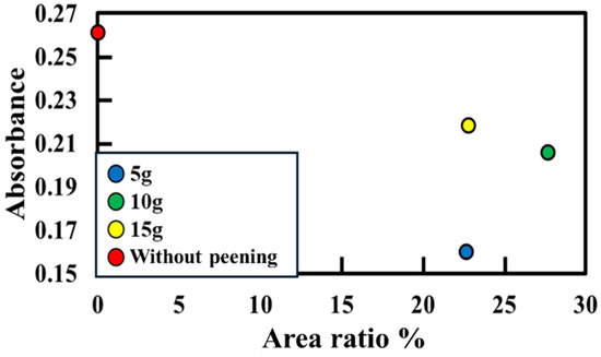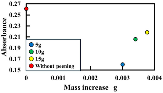 Figure 17 shows the relationship between the total peening mass and absorbance. A decrease in absorbance indicates antibacterial activity. Absorbance can be observed to be the highest when no peening is applied. As the total peening mass decreases, absorbance also decreases.