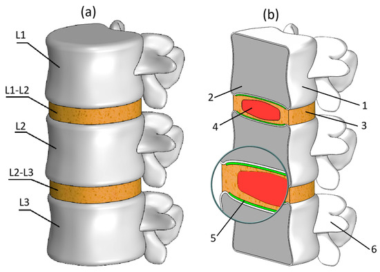 (a) Trimetric view of numerical lumbar spine model; (b) Section view of the model: 1—cortical shell, 2—cancellous bone, 3—annulus fibrosus, 4—nucleus pulposus, 5—bony endplate, 6—posterior elements.