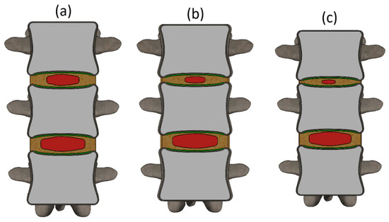 Different stages of the L1–L2 IVD degeneration (sectioned frontal view): (a) Mild degeneration; (b) Moderate degeneration; (c) Severe degeneration.