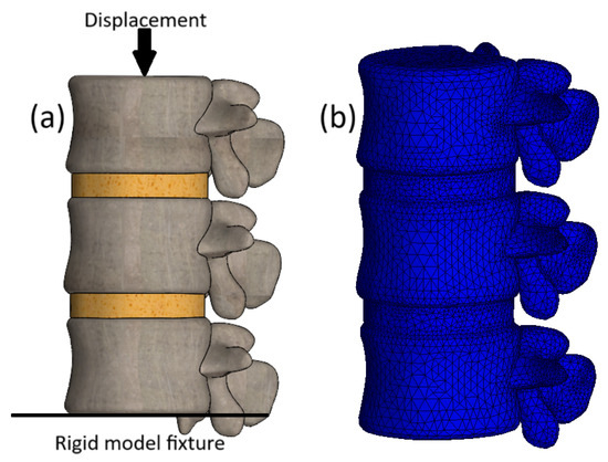 The loading configuration is illustrated in Figure 3a. The inferior surface of the L3 vertebra was fully constrained to prevent any motion, while a uniform prescribed displacement of 2.5 mm was applied directly to the superior endplate of L1 across all models developed in this study. The loaded surface was defined as a rigid kinematic boundary (equivalent to a rigid plate), ensuring all nodes moved uniformly. This combination of fixed inferior constraint and rigid displacement loading is known to influence apparent segment stiffness and reaction forces by restricting global deformation modes and enforcing uniform axial compression.