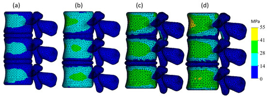 In the healthy model (Figure 4a), most stress is concentrated in the cortical shell of the vertebral bodies with stress magnitudes predominantly ranging between 14 and 28 MPa (cyan zones). The distribution appears uniform, while stress within the intervertebral discs and posterior elements remains minimal, typically below 14 MPa (blue zones).