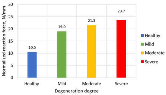 To account for geometric changes across degeneration stages, reaction forces were normalized by the total vertical height of the L1–L3 segment, measured from the inferior surface of L3 to the superior surface of L1. The normalized values were healthy (97 mm) → 10.5 N/mm; mild degeneration (95 mm) → 19.0 N/mm; moderate degeneration (93 mm) → 21.5 N/mm; severe degeneration (91 mm) → 23.7 N/mm. This normalization reveals that effective segmental stiffness increases by approximately 126% from healthy to severe degeneration, reflecting the combined effects of material stiffening and geometric compaction (Figure 6).