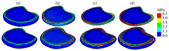 The von Mises stress plots for models with different degeneration types in case of 2.5 mm displacement are presented in Figure 4.