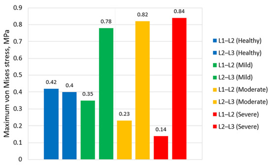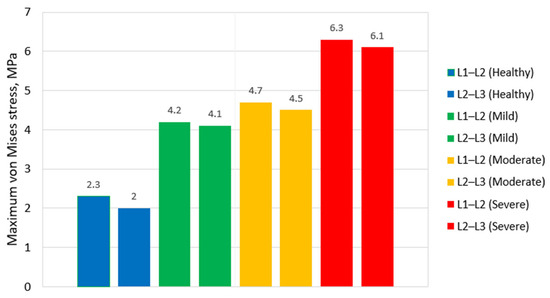 Figure 9 illustrates the maximum von Mises stress values in the nucleus pulposus of the L1–L2 and L2–L3 discs for different stages of IVD degeneration. In the healthy models, the peak stresses in the nucleus pulposus of both discs are nearly identical (0.42 MPa for L1–L2 and 0.40 MPa for L2–L3). In mild degeneration at L1–L2, the stress in the degenerated L1–L2 nucleus slightly decreases to 0.35 MPa, consistent with early loss of hydrostatic capacity. Interestingly, the adjacent intact L2–L3 disc experiences a marked increase in nucleus stress (up to 0.78 MPa), likely due to increased load transmission through the mildly stiffened L1–L2 segment under the fixed displacement boundary condition. This effect diminishes in moderate and severe degeneration as the L1–L2 disc loses most of its load-bearing capacity, shifting stresses primarily to the annulus and posterior elements.