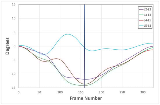 Intervertebral rotation graph of L2-3 to L5-S1 motion during standing flexion and return in an asymptomatic control participant measured using quantitative fluoroscopy (QF). (Blue vertical line indicates point of maximum global flexion.) L5–S1 exhibits anti-directional motion in its outward path, returning to its starting position by the end of its global range. A video of the motion sequence depicted in this graph can be found published along this manuscript as a graphical abstract. (Source: Breen, A.; Breen, A.; Reference Database of Continuous Vertebral Flexion and Return. Open Science Framework 2022, https://doi.org/10.17605/osf.io/a27py).