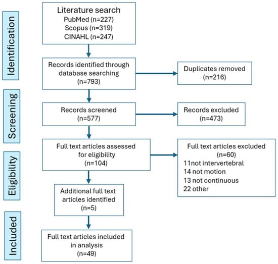 Database searching identified 793 studies, of which 216 were duplicates and were removed, leaving 577 for consideration (Figure 2). After title and abstract screening, 473 of these were excluded, leaving 104 for full-text screening. Of these, 60 were excluded, mainly because they did not study intervertebral motion (11), did not study motion (14), or did not study continuous motion (13). After the addition of five studies from other sources known to the authors, and following full-text screening, 49 studies were found to be eligible for review. The 5-year distribution of publication dates of the 104 that underwent full-text screening shows an approximate doubling of articles that were published 5 years after the first decade of the study period (Figure 3).