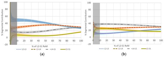 Average segmental contributions (L2–3 to L5–S1) during (a) standing flexion and (b) return in 127 healthy controls. Shaded areas indicate 95% confidence intervals. (from: Breen, A.; Breen, A. Reference Database of Continuous Vertebral Flexion and Return. Open Science Framework 2022, https://doi.org/10.17605/osf.io/a27py). (Grey shading over the first 10% of the motion in both graphs indicates high error areas to be ignored due to small values in the percentage calculations).