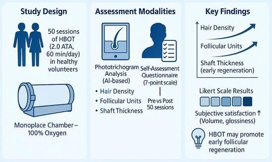 Given this background, the present study aims to evaluate the effects of hyperbaric oxygen therapy on hair follicles and hair characteristics in healthy adult subjects. By analyzing pre- and post-therapy morphological changes, this research seeks to explore the regenerative potential of HBOT in a novel domain and assess its implications for both medical and esthetic applications. By integrating objective phototrichogram-based measurements with structured subjective assessments, this study seeks to address this translational gap and provide preliminary data on HBOT exposure independent of procedural confounders. Rather than establishing therapeutic efficacy, this exploratory investigation seeks to generate preliminary observational data that may inform future controlled studies in clinical hair loss populations.