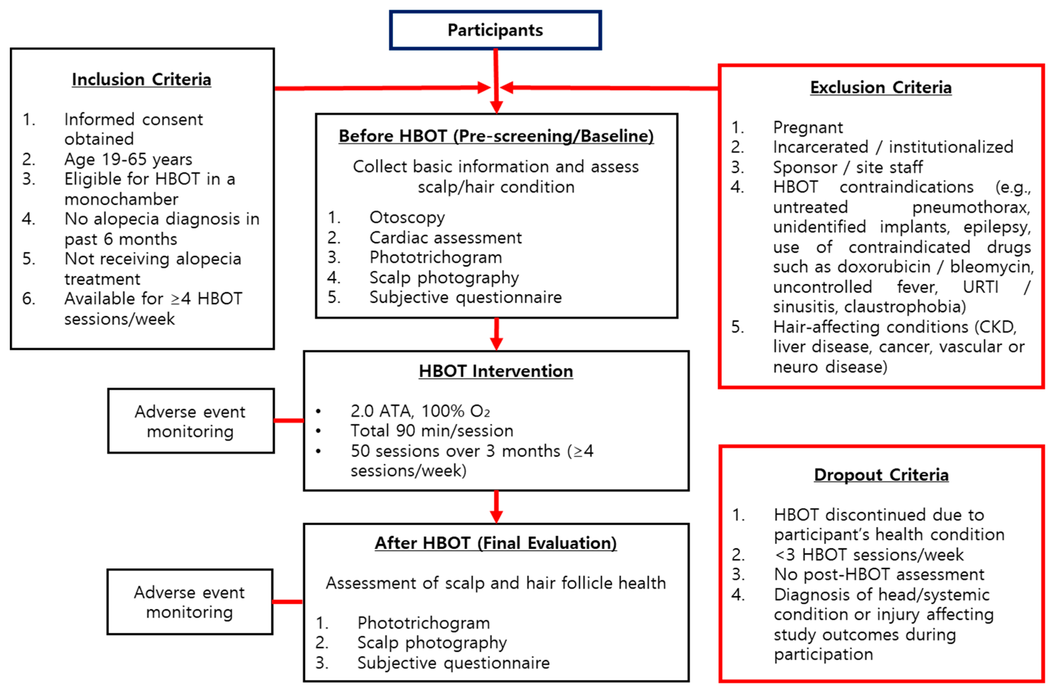 Figure 2). Participants were recruited based on specific inclusion criteria, including adults aged 19 to 65 who were capable of undergoing HBOT in a hyperbaric monochamber, with no history of hair loss diagnosis or treatment in the previous six months. Exclusion criteria included pregnancy, incarceration, institutionalization, contraindications for HBOT, and possession of specific medical devices. During the screening and baseline phases, participants underwent a comprehensive physical examination, a medical history review, and safety assessments, including otoscopic and cardiovascular evaluations. Scalp and hair condition were objectively assessed using the Becon phototrichogram system, and subjective perceptions were recorded through structured questionnaires. The HBOT intervention was administered at 2.0 ATA (atmospheres absolute) with 100% oxygen for 90 min per session (15 min compression, 60 min oxygenation, 15 min decompression) at least four times a week for a total of 50 sessions over three months. All treatments were conducted in a controlled chamber environment, with safety protocols strictly followed, including pre-treatment education on pressure equalization techniques and restrictions on prohibited items. After completing the 3-month intervention, participants underwent the same evaluations as those conducted during the baseline phase to assess changes in hair and scalp condition, subjective perceptions, and to monitor for any adverse effects. This structured flow ensured both clinical safety and methodological consistency throughout the study.