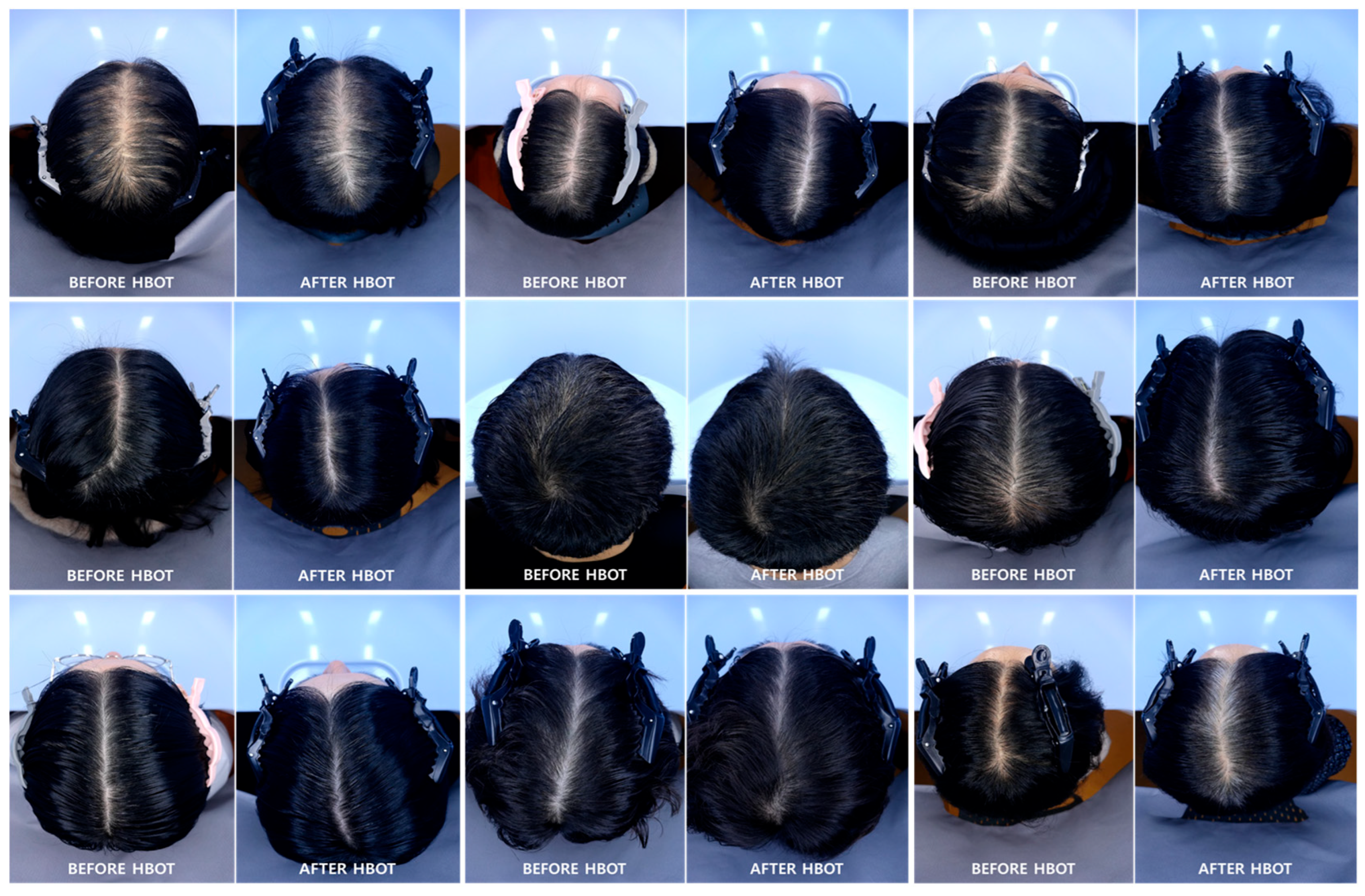Despite the promising nature of these findings, several limitations must be acknowledged. First and foremost, the small sample size (n = 9) restricts the statistical power of the study and limits its generalizability. A larger cohort is needed to confirm these preliminary trends and to assess treatment efficacy more robustly. Second, the lack of a control group hinders the ability to attribute observed changes solely to HBOT. Without comparison to a placebo or non-treatment arm, potential placebo effects or confounding factors—such as seasonal hair changes or grooming habits—cannot be ruled out. Third, although the study involved 50 treatment sessions over three months, this duration may have been insufficient to observe the full extent of follicular transformation, particularly the conversion of vellus hairs into terminal hairs. Hair growth is a slow process, and longer follow-up periods are necessary to evaluate the sustainability and progression of treatment effects. In addition, the present study did not assess long-term outcomes beyond the intervention period. Therefore, it remains unclear whether the observed directional trends would persist, stabilize, or diminish over time. Larger-scale longitudinal studies are required to confirm the durability of any potential effects on hair characteristics. Although no serious adverse events were reported during the intervention, repeated HBOT exposure may be associated with mild transient symptoms such as headache or dizziness. Furthermore, theoretical concerns regarding potential physiological overstimulation, including possible alterations in scalp sebum production, should be considered. Future investigations should incorporate systematic safety monitoring to better characterize both short- and long-term tolerability. Fourth, the HBOT protocol used in this study was adapted from the US Navy protocol rather than a dermatologically standardized regimen. This modification, intended to accommodate participant compliance and safety, may limit direct comparability with other HBOT studies and underscores the need for standardized treatment protocols in future trials. Fifth, the discrepancy between subjective improvement and largely non-significant objective findings (except hair shaft thickness) raises important questions. While the consistent positive trends across objective parameters suggest biological response, it is also possible that the subjective benefits were influenced by expectancy effects. Integrating histological analyses, such as scalp biopsies or trichoscopy, in future research could provide more definitive evidence of follicular regeneration at the cellular level. Sixth, while photographs offered a valuable visual tool for evaluating hair condition, the resolution was insufficient to demonstrate individual follicle-level changes. Additionally, hair dyeing status, which was not standardized, may have affected visual perception of hair thickness or color. Future studies should incorporate high-resolution imaging technologies and control for such variables to ensure more accurate visual assessment. Lastly, while no adverse effects (e.g., barotrauma, dizziness, oxygen toxicity) were reported during the intervention period, a formal evaluation and documentation of safety outcomes should be included in future research. Establishing a favorable safety profile is essential for broader clinical application.