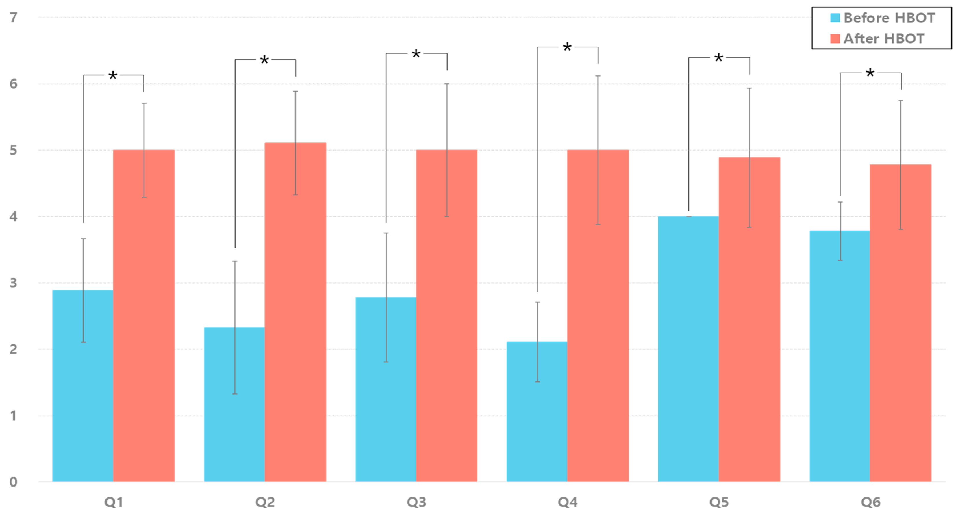 Statistical analyses were conducted using SPSS Statistics (Version 28.0, IBM Corp., Armonk, NY, USA). To evaluate the effects of hyperbaric oxygen therapy (HBOT), appropriate statistical tests were applied according to the type and distribution of each variable. For continuous variables (e.g., follicle density, hair per follicle, hair volume, hair thickness, and total score), normality was assessed using the Shapiro–Wilk test. If the data were normally distributed, a paired t-test was used to compare the means before and after HBOT. When normality was not satisfied, the non-parametric Wilcoxon signed-rank test was employed. For categorical variables (e.g., presence or absence of symptoms or complications), the McNemar test was used to assess changes in paired proportions before and after treatment. Subjective outcomes were evaluated using six self-reported items rated on a 7-point Likert scale (e.g., “The overall appearance of the scalp is improving”, “The crown of the head is growing longer”, “The amount of hair falling out is decreasing”, “The hair is getting thicker”, “The hair growth rate is getting faster”, and “The front hairline is improving”). Given the ordinal nature of these responses, pre- and post-treatment comparisons were conducted using the Wilcoxon signed-rank test. To visually illustrate changes in response patterns, frequency distribution plots were generated. All statistical tests were two-tailed, and a p-value of less than 0.05 was considered statistically significant. In addition to p-values, effect sizes were calculated to estimate the magnitude of observed changes. For paired comparisons, Cohen’s d was calculated by dividing the mean of the paired differences by the standard deviation of the difference scores (dz) and interpreted as small (0.2), medium (0.5), or large (0.8) effects.