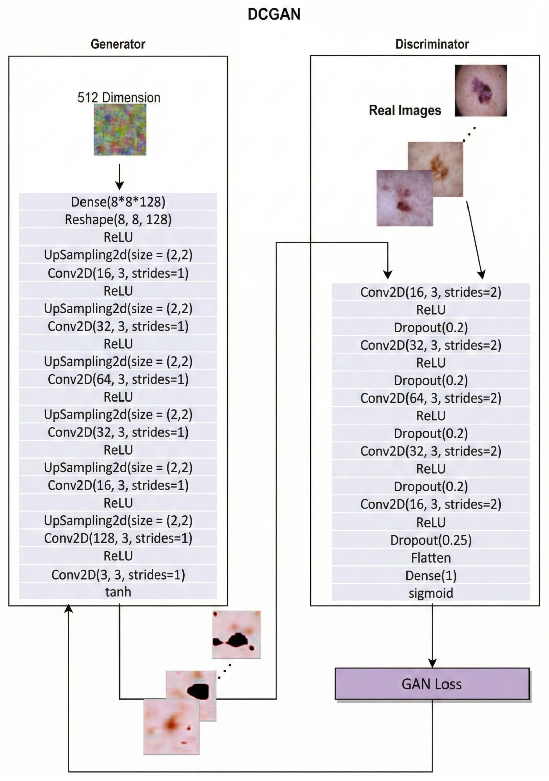 Figure 2. DCGAN architecture showing the generator and discriminator networks, including layer configuration, upsampling and strided convolutions, and output activations.