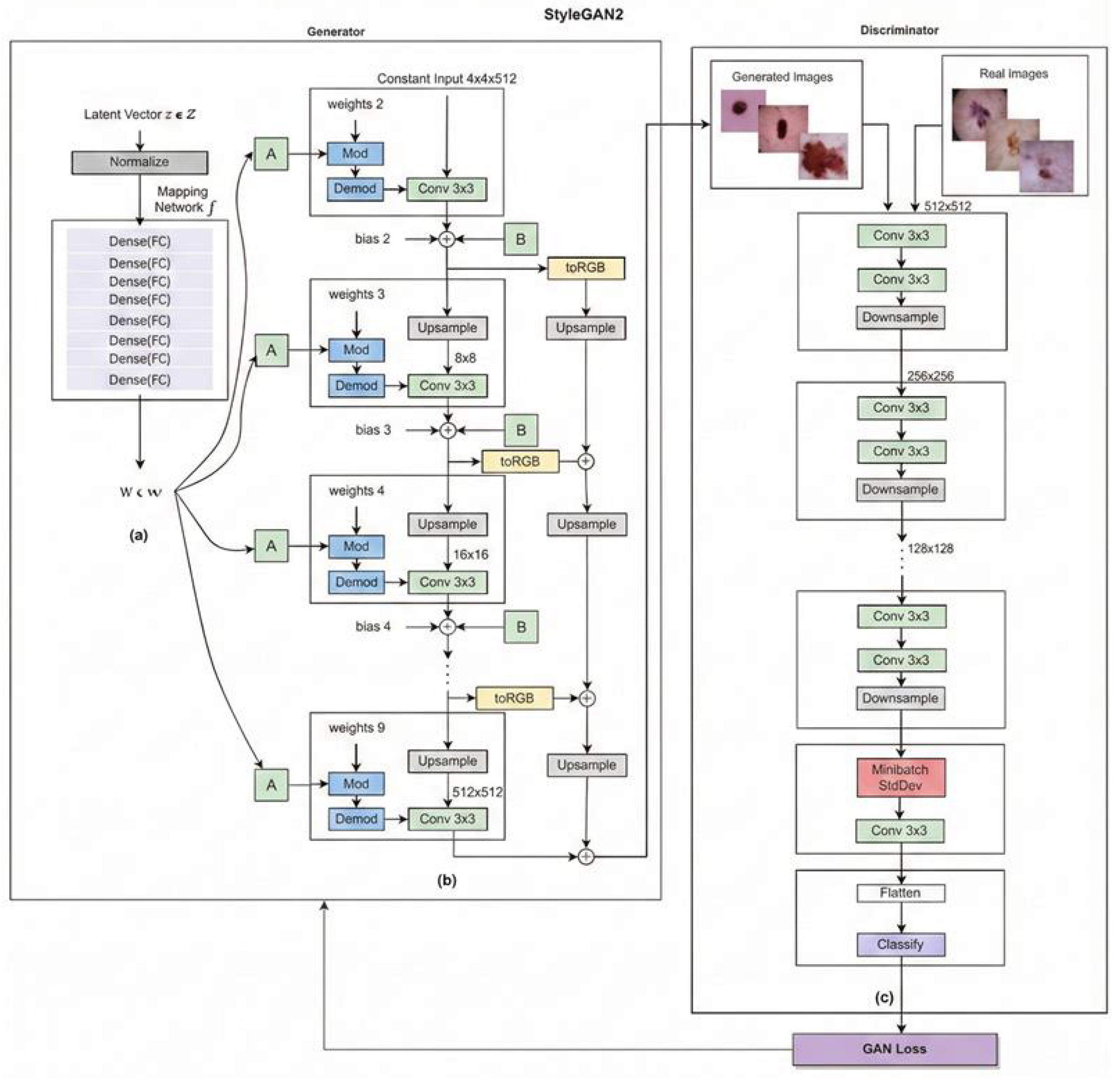 Figure 3. StyleGAN2 architecture illustrating the generator and discriminator networks. In the generator, (a) denotes the learned affine transformation used for style modulation, (b) represents the learned per-channel scaling factor, and ⊕ indicates element-wise addition. In the discriminator, (c) denotes the final classification stage.