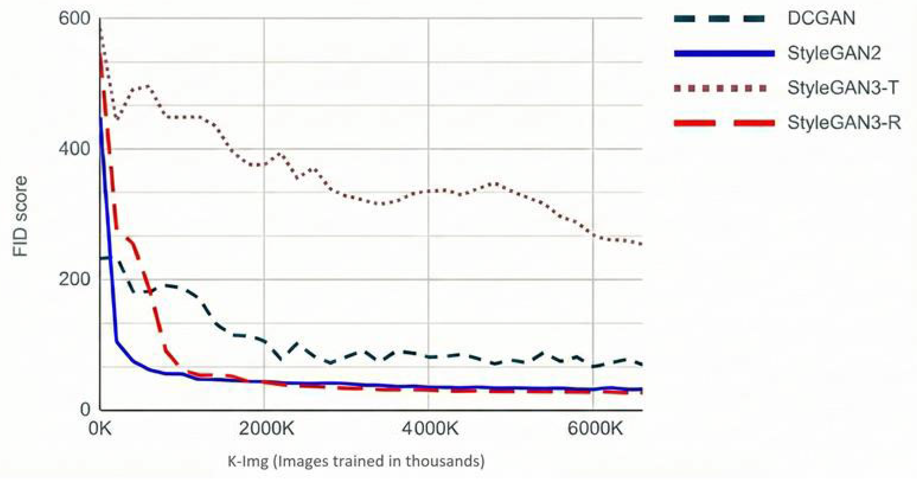 Figure 5. FID score as a function of training images (thousands) for each architecture. StyleGAN2 shows consistent improvement with additional data, while StyleGAN3-T plateaus at substantially higher FID values.