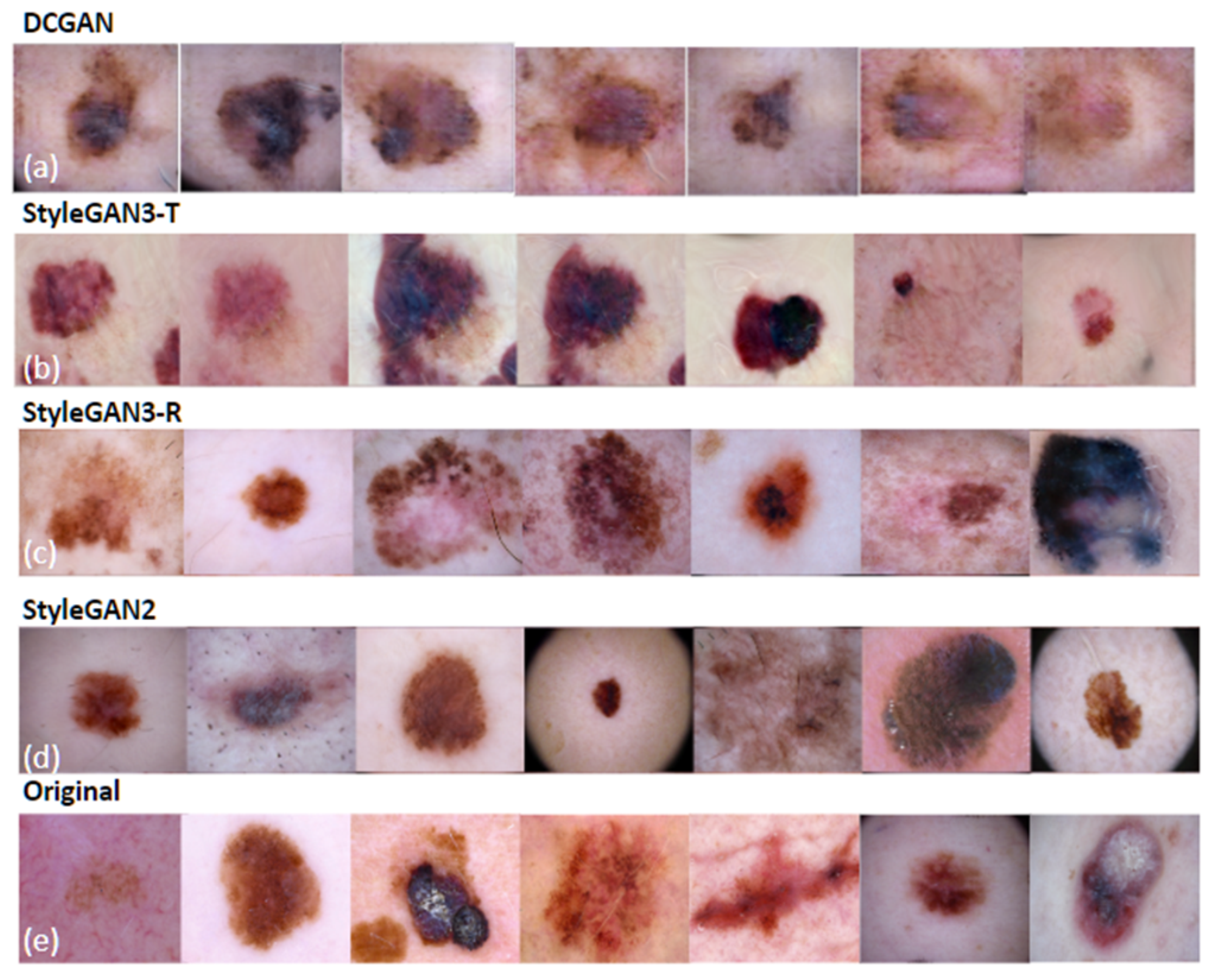 The main contributions of this work are threefold: (1) a systematic cross-architecture comparison of DCGAN, StyleGAN2, and StyleGAN3 variants (T and R) for melanoma-specific image synthesis under consistent experimental conditions, with empirical evidence that StyleGAN2 provides the best balance of quantitative performance, perceptual quality, and artifact avoidance; (2) domain-specific hyperparameter optimization, particularly regarding R1 regularization strength ( γ ), with practical guidance for melanoma synthesis; and (3) a multi-faceted evaluation protocol combining distribution-level metrics, sample-level representativeness, downstream classifier validation, and independent assessment by two board-certified dermatologists. This demonstrated that 83% of StyleGAN2-generated images are recognized as melanoma by a strong external classifier and that expert dermatologists distinguish synthetic from real images at only 66.5% accuracy.
