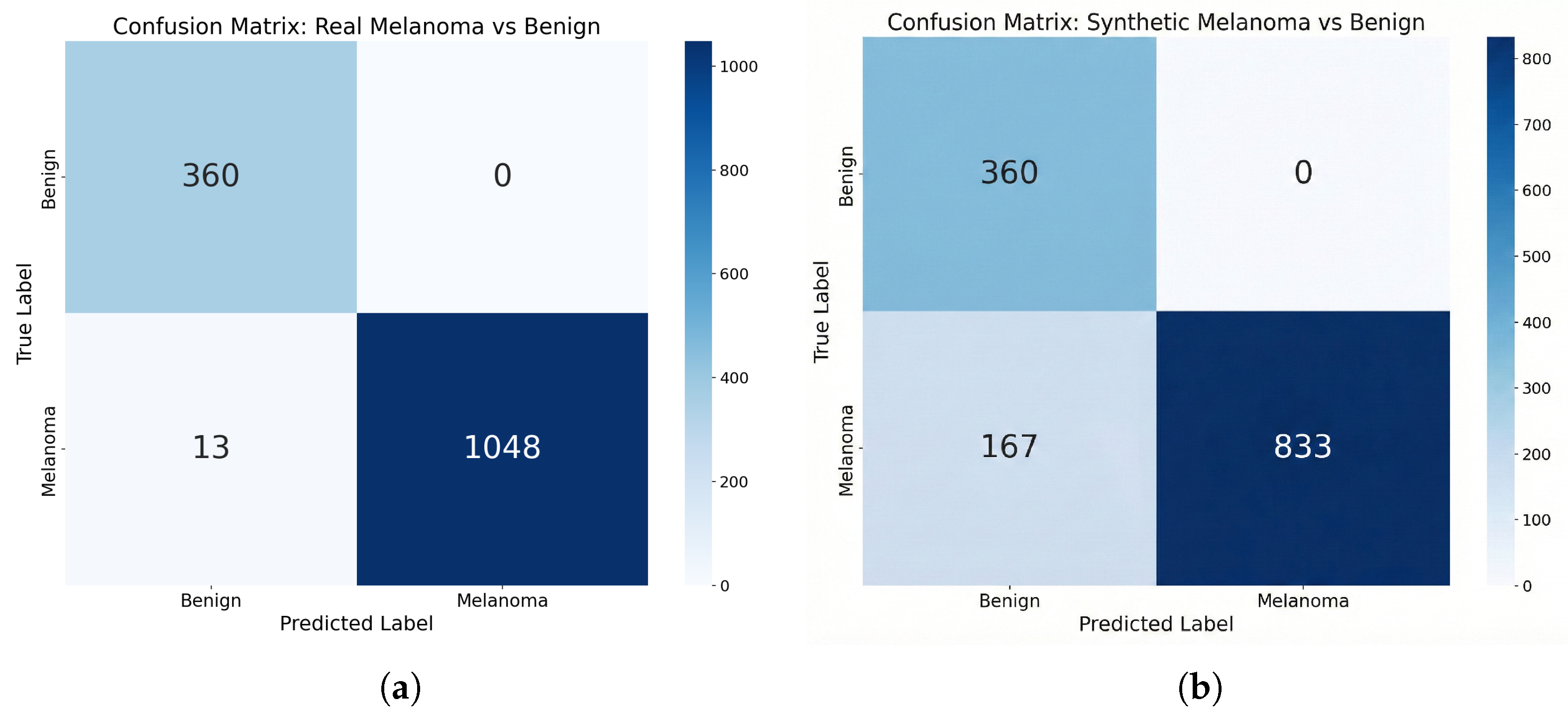 Figure 7. Confusion matrices for the frozen external classifier on (a) the Real set (real melanoma vs. real benign) and (b) the Synthetic set (StyleGAN2-generated melanoma vs. real benign). The classifier recognizes 83% of synthetic melanomas as melanoma.