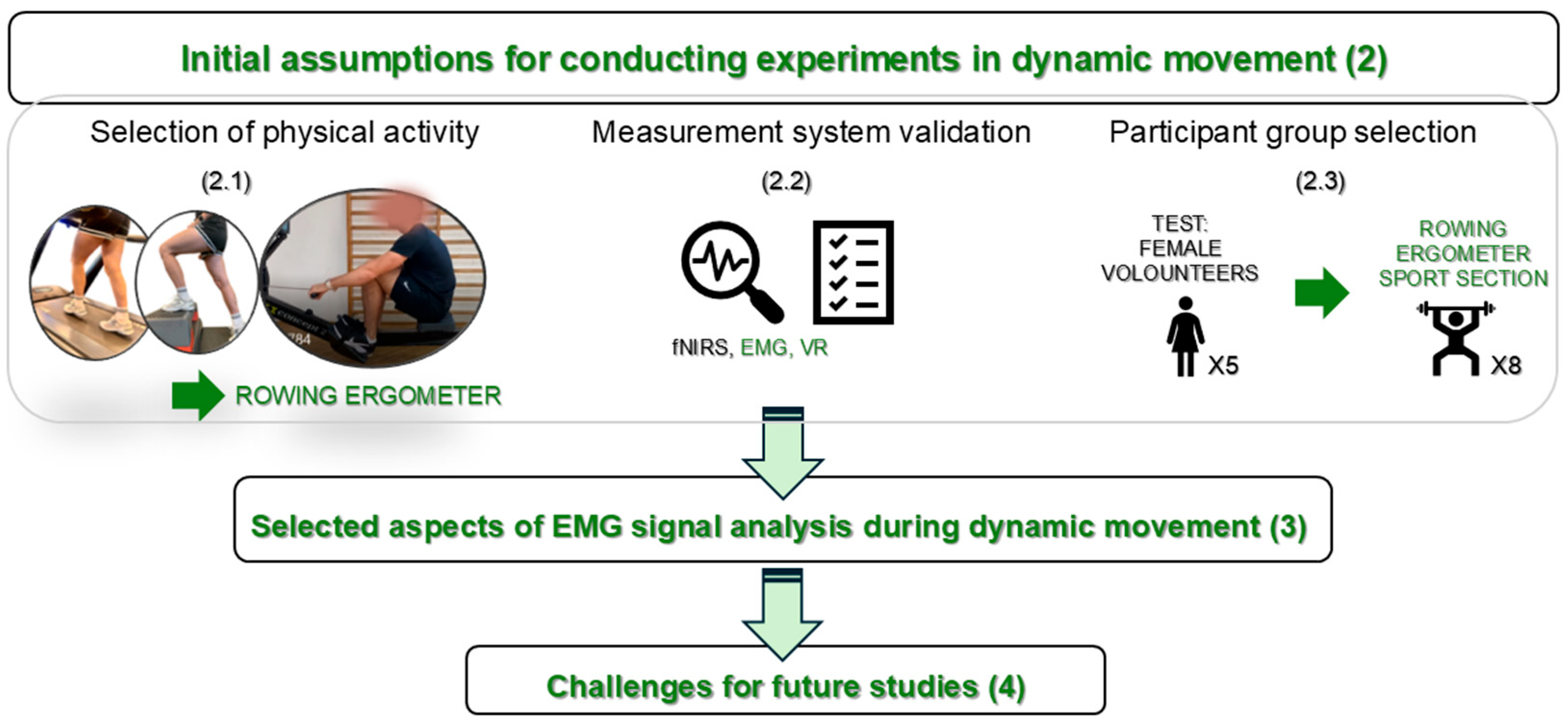 - Daniel, N.; Małachowski, J.; Sybilski, K.; Siemiaszko, D.; Klicki, K. Research on the Influence of Virtual Reality on Muscle Fatigue during Rowing Ergometer Exercise—Pilot Study. PLoS ONE 2026, 21, e0342166. [Google Scholar] [CrossRef] [PubMed]
