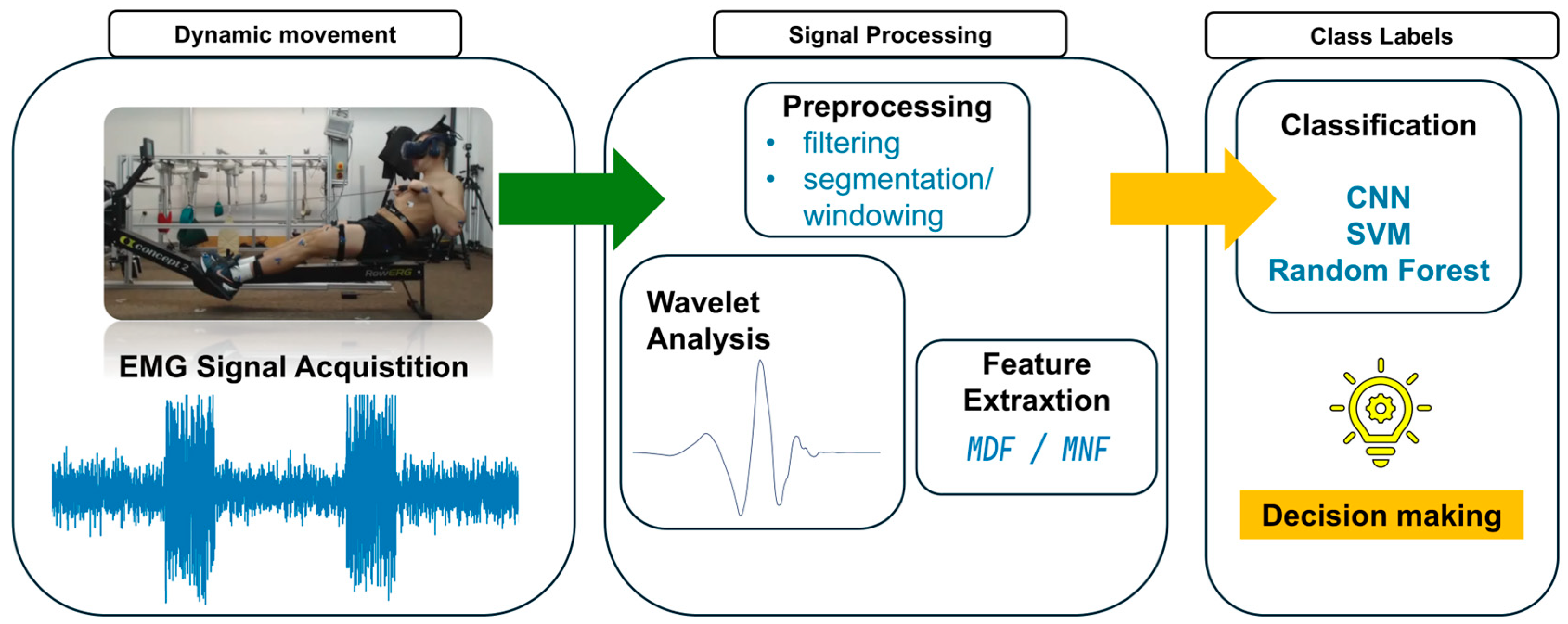 | [57] | DWT | Random Forest, KNN, Decision Tree | Hand movement classification, feature extraction | The effectiveness of different feature extractors and classifiers was compared, identifying combinations that produced good results; DWT features showed competitive effectiveness. |